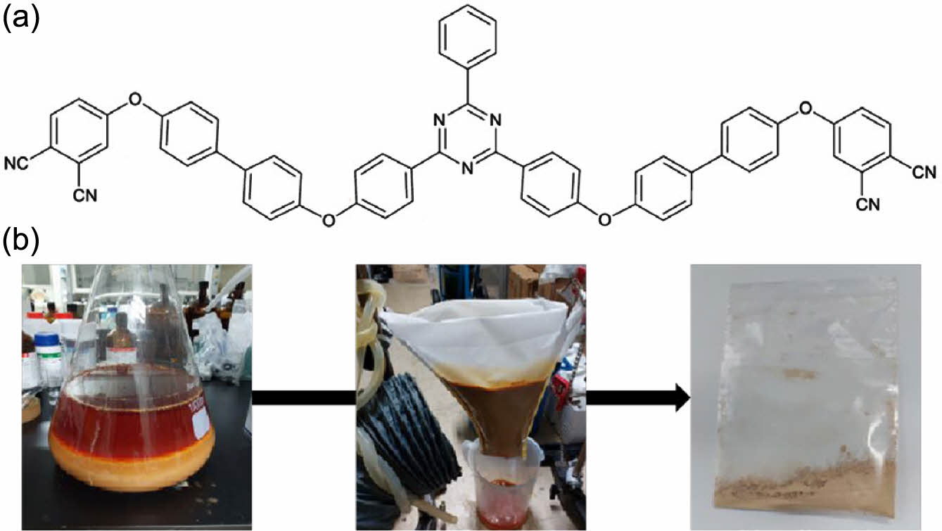All chemicals were purchased from Sigma-Aldrich and used without purification. The initial mixture composed of 4-fluorobenzonitrile (200 g, 1.65 mol), benzoyl chloride (93 g, 0.66 mol), ammonium chloride (106 g, 1.98 mol), and aluminum chloride (106 g, 0.79 mol) was heated to 150 ℃ for 24 h. The subsequent cooling procedure entailed dropwise addition of cold water (1 L) until the temperature descended to 0 ℃, followed by the introduction of hydrochloric acid (36.5%, 200 g). The resultant compound 1 was subsequently washed with distilled water. The compound 2 was obtained by adding 4,4’-dihydroxybiphenyl (82 g, 0.44 mol), calcium carbonate (82 g, 0.58 mol), 1-methyl-2-pyrrolidone (600 mL), and toluene (600 mL) to compound 1, and heated to 150 ℃ (Figure 1). Toluene was removed via a Dean-Stark apparatus and the remaining solution cooled. The preceding compound (76 g, 0.22 mol) and 1-methyl-2-pyrrolidone (500 mL) were integrated at 150 ℃ for 3 h, followed by the addition of 4-nitrophthalonitrile (89 g, 0.51 mol) and 1-methyl-2-pyrrolidone (500 mL) at 50 ℃. The final compound was achieved via MeOH suspension and dried after the nonwoven filtration for three times. Verification of the surface characteristics was done using scanning electron microscopy (SEM) with energy dispersive X-ray (EDX) microanalysis (FEI Quanta 650 FEG SEM, Thermofisher Scientific). Owing to a high glass transition approaching 400 ℃, differential scanning calorimetry results were omitted due to the absence of a significant peak. Thermal properties were assessed via time-domain thermogravimetric using TGA-8000 (PerkinElmer).