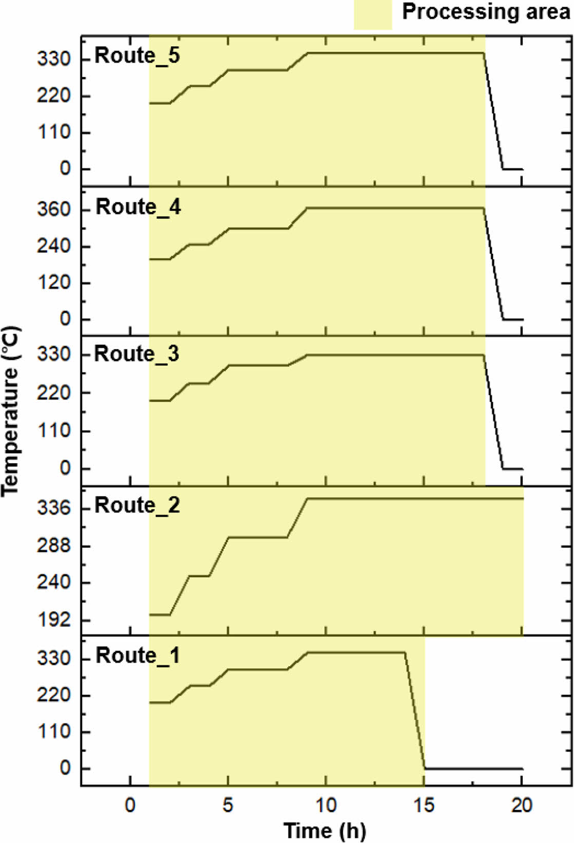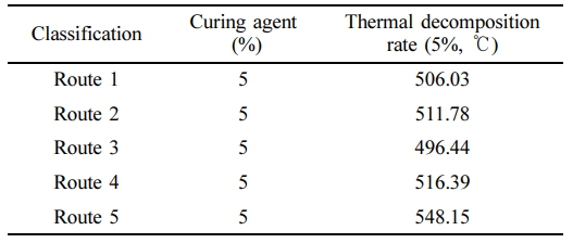 Our work encompassed various stages to assess the effects of varied curing times and temperatures (Figure 2 and Table 1). Each stage utilized a constant 5% sulfur-containing curing agent. Routes 1 and 2 are characterized by the shortest and longest final curing times, respectively. The brief curing duration in Route 1 insufficiently facilitated the monomer-to-polymer conversion, while in Route 2, an overlong curing duration risked polymer degradation. Routes 3 and 4, marked by the lowest and highest curing temperatures, respectively, also underperformed in terms of thermal endurance. While higher temperatures can expedite crosslinking reactions, an overly elevated temperature can induce premature crosslinking, thus resulting in an inhomogeneous network structure. Conversely, low temperatures as encountered in Route 3 may yield an inadequate curing process. It was observed that Route 5, which balances the extremes of both time and temperature, showcased superior thermal characteristics. Therefore, the findings underscore the importance of not only selecting an appropriate curing agent, but also optimizing the curing parameters to ensure optimal synthetic outcomes.