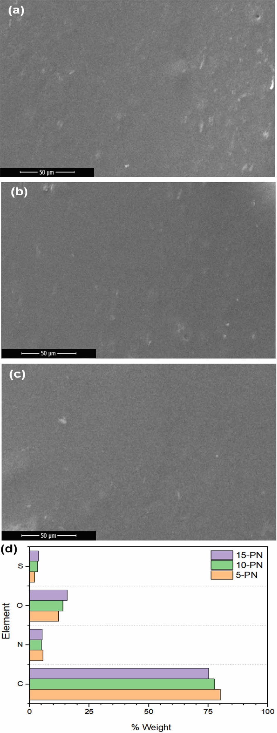 Figure 3 SEM results of (a) 5-PN; (b) 10-PN; (c) 15-PN. Following EDX results are plotted in (d). |