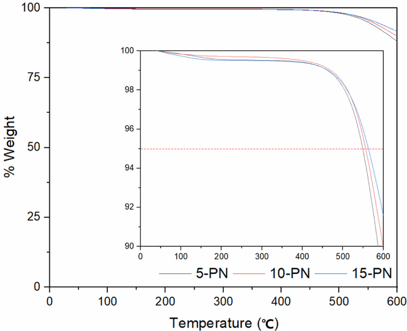 Regarding the aforementioned synthetic pathways, our work pursued Route 5, and further varied the proportion of the curing agent by 5, 10, and 15%. For the sake of simplicity, the derived samples were denoted as 5-PN, 10-PN, and 15-PN, respectively. Successful treatment of the curing on the PN was evidenced as displayed in Figure 3. Upon visual examination, SEM images of each sample did not reveal distinguishable differences. However, EDX results indicated more perceptible variations with different ratio of curing agents. It is noteworthy that the proportion of sulfur content does not linearly correlate with the applied proportion of curing agents. This deviation can be attributed to uneven mixing during the process, thus hindering a complete homogenization. Nevertheless, the sulfur content ratio was observed in a descending order from 15-PN, 10-PN, to 5-PN. TGA results demonstrated that the 15% of curing agent imparted the highest thermal stability, with a decrease evident as the proportion of curing agent was reduced (Figure 4 and Table 2). Interestingly, the difference between the thermal stability of samples with 10% and 15% curing agent was not as substantial as that between 5% and 10%. This could potentially be attributed to the inherent spatial constraints within the PN structure, which may limit the degree of interaction with the curing agent. In this part, further modelling studies are required to explore the realistic molecular behavior.