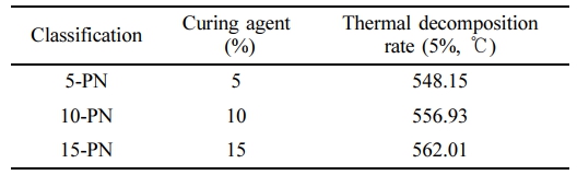 Phthalonitrile was examined by altering the amount of sulfur-containing curing agent and utilizing different curing steps. Utilizing the Flynn-Wall-Ozawa equation, it was verified that the activation energy correlated with the thermal decomposition rate and the quantity of curing agent.