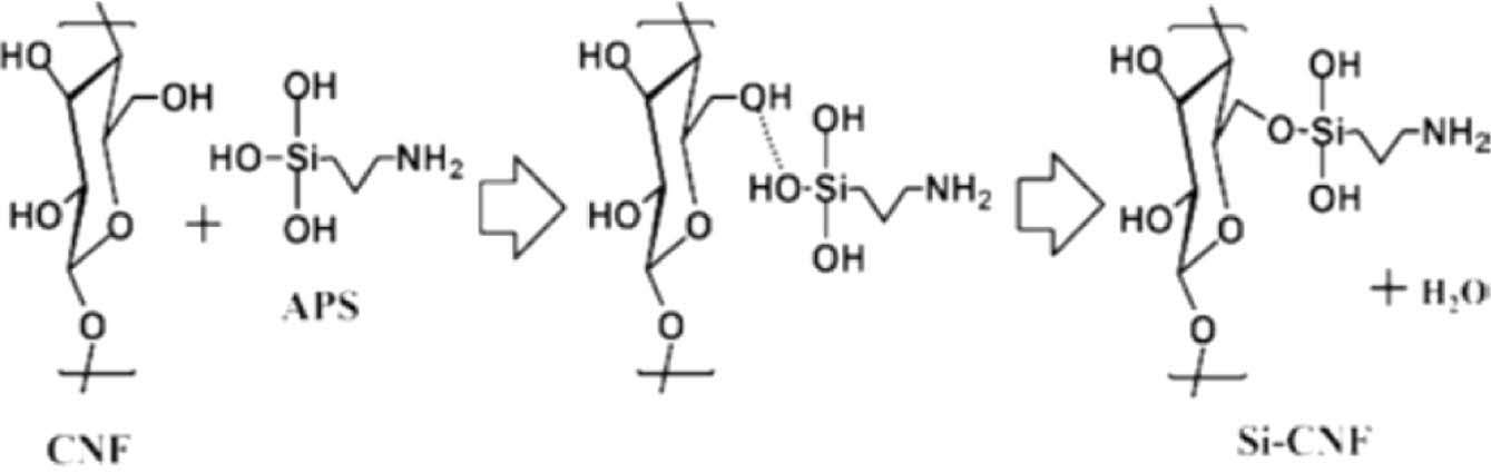 CNF의 실란 처리 및 CNF의 미립화. CNF의 실란처리 시 실란처리제의 양은 기존 연구 결과에서16 적정 함량으로 얻은 1 wt% 기준으로 진행하였다.에탄올 80 wt% 혼합용액에 APS 1 wt%를 넣어 1시간 동안 교반하여 실란커플링제의 가수분해를 진행하였고, 에탄올 혼합용액에 1 wt% CNF slurry를 혼합하여 2시간 동안 추가 교반을 통해 CNF에 실란 처리를 진행하였다. 이후, 실란 처리된 CNF slurry의 용매를 제거하기 위해 트레이에 붓고 50 ℃ 대류오븐에서 24시간 동안 건조한 후 120 ℃에서 2시간 동안 열처리하여 경화하였다. 실란 처리된 CNF를 오븐에서 건조 시 얻은 필름형태의 시료를 미립화하기 위하여 micro mill(Poly MIX PX-MFC 90D, Switzerland)과 planetary ball mill(Fritsch Pulverisette 5, Germany)을 이용해 분쇄하였다. Planetary ball mill은 쇠구슬(steel ball)을 CNF 무게 대비 15배로 하여 600 rpm에서 1시간 진행하였다. Figure 1은 CNF에 APS가 화학반응하는 메카니즘을 나타낸 것이다.