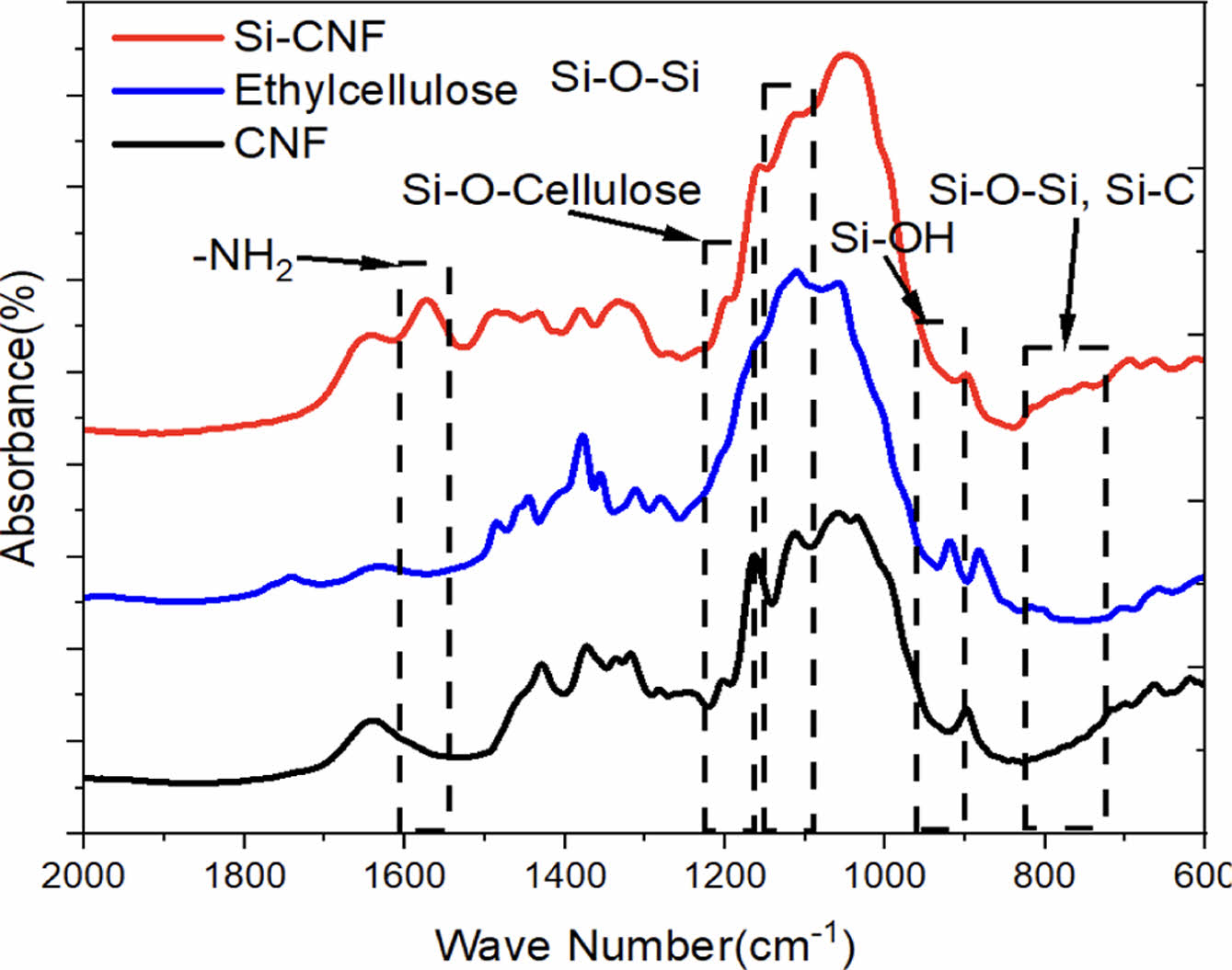 FTIR spectra of ethylcellulose, CNF and Si-CNF.
