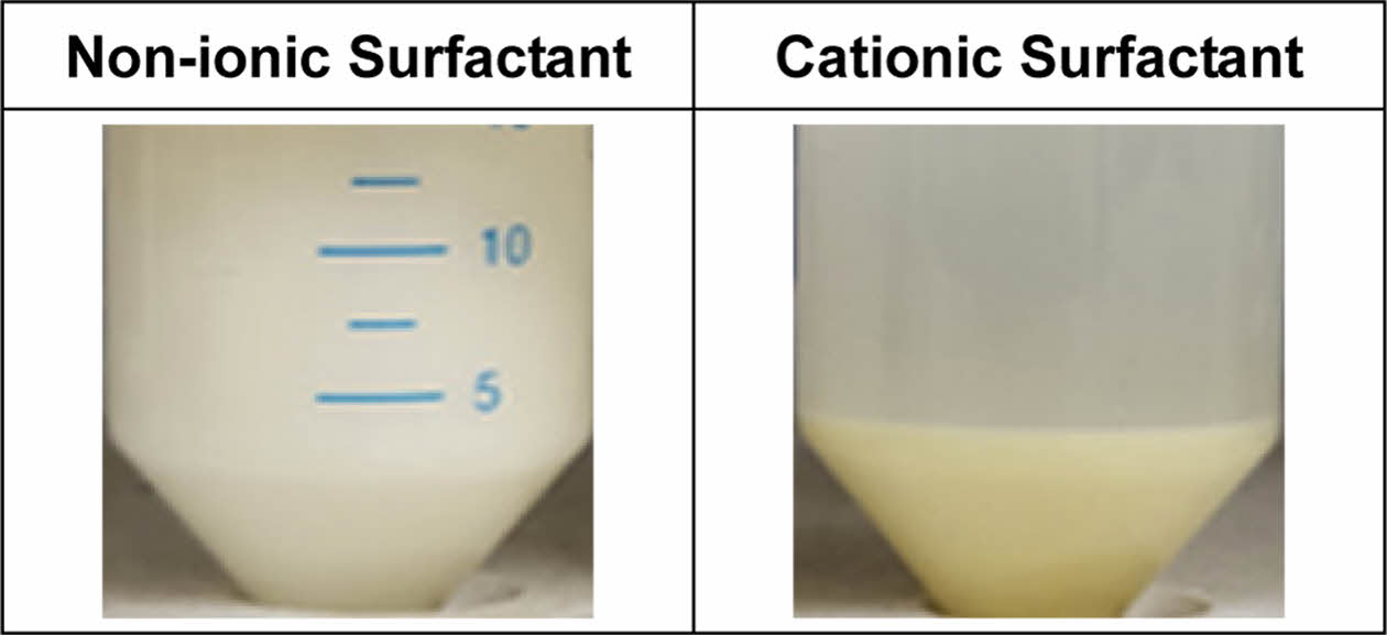 제조한 Si-CNF 분말을 기존 바인더인 에틸셀룰로오스와 같은 용매인 2-에톡시에탄올에 24시간 동안 70 ℃에서 교반시켜 혼합한 후 방지하면 2-에톡시에탄올/Si-CNF 용액에서 층 분리가 발생하였다(Figure 4의 2-EE 참조). 층 분리 문제를 해결하기 위해서 극성 지수(polar index)가 다른 용매와 분산제(계면활성제)에 대한 실험을 추가로 진행하였다. 우선은 에틸셀룰로오스와 용매 시스템을 동일하게 하기 위해서 2-에톡시에탄올에 분산제를 적용하는 실험을 진행하였고, Figure 2는 양이온과 비이온 분산제 각각에 대해 바인더와 분산제의 혼합비를 1:2 비율(이는 혼합비율 실험시 1:1의 경우 분상상태가 유지되지 않았고, 1:2 이후에는 큰 차이가 없어 1:2를 최적 혼합비로 함)로 용액을 제조한 후 30분이 경과한 후 용액의 상태를 비교한 결과이다. 30분이 경과하였을 때 양이온 분산제를 첨가한 용액에서는 침전되어 층 분리가 발생한 반면, 비이온 분산제를 첨가한 용액은 30분 경과후에도 전체적으로 분산상태를 유지하는 것을 보여주었다.