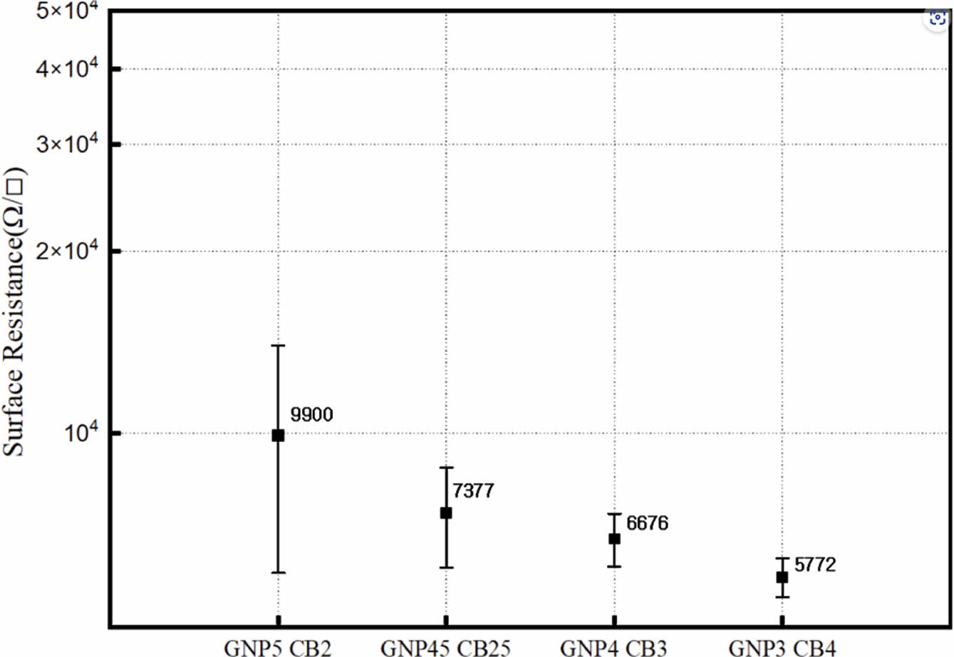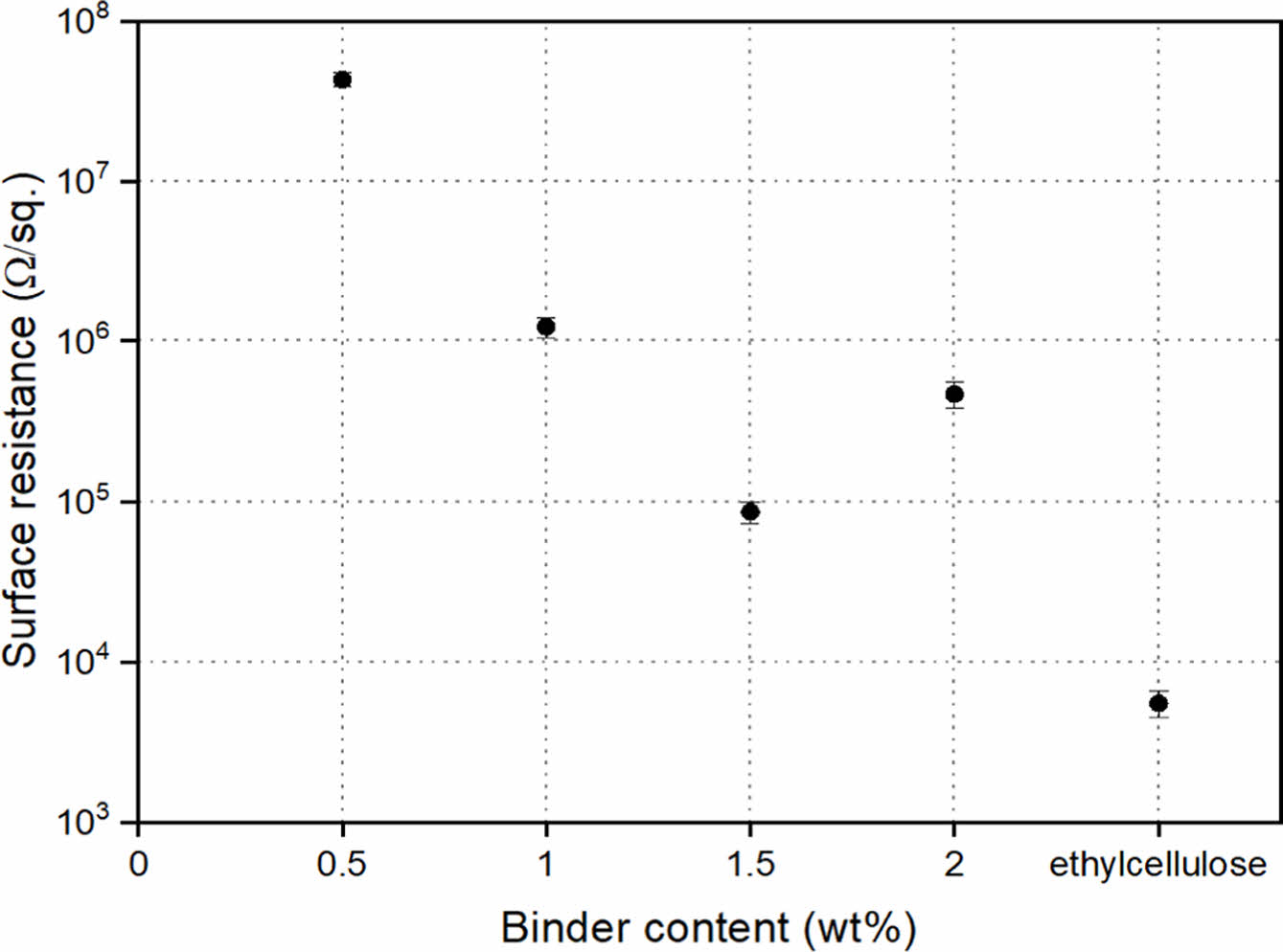 Si-CNF 함량에 따라 제조한 페이스트의 표면저항성을 측정한 결과를 Figure 5에 나타내었다. 기존 에틸셀룰로오스 바인더 적용 페이스트 보다 표면저항이 전체적으로 높은 경향을 보이고 있다. 이와 같은 결과는 향후 센서 반응성에 영향을 줄 수 있기 때문에 전도성 필러의 재조합 실험이 필요한 것으로 판단하였고 GNP와 CB의 함량 변경에 따른 표면저항 변화를 측정하였다. 폴리아닐린의 양은 고정하고 GNP와 CB의 배합비를 아래 Table 1과 같이 변경하였다. 바인더 함량이 2 wt% 이상에서 표면저항이 증가하는데, 이는 바인더 함량이 낮은 부분에서는 필러의 분산이 개선되다가 2 wt% 이상에서는 분산 효과보다는 바인더 첨가에 의한 전도성 감소 효과가 우세하기 때문으로 해석된다.
