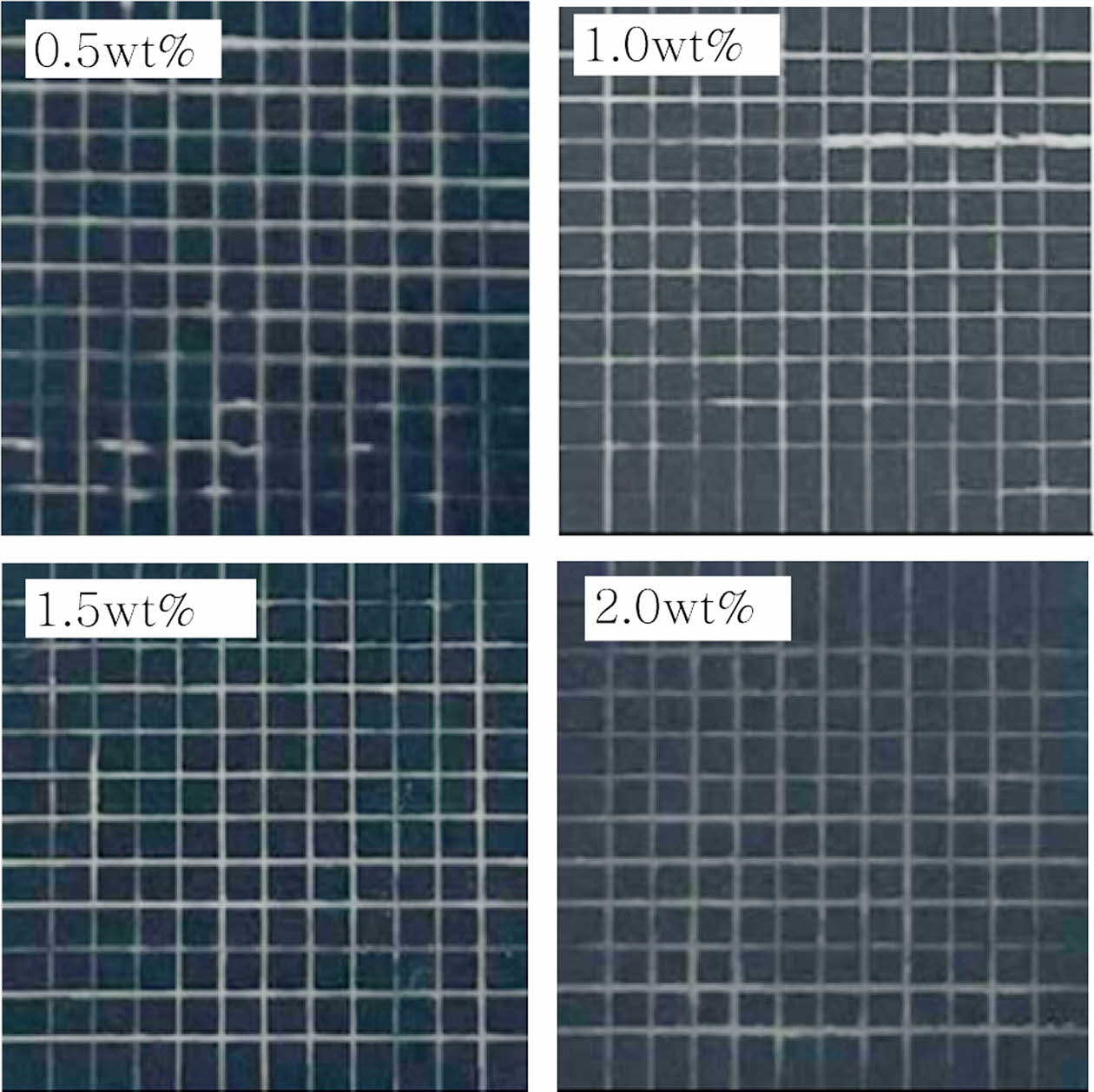 Figure 7은 Si-CNF 함량에 따라 제조된 전도성 페이스트가 코팅된 시편의 Cross-Cut 시험 후 사진을 보여주는 것이다.