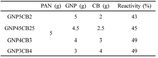 표면저항 변화에 추가하여 Si-CNF 바인더의 첨가는 전도성의 감소를 야기할 수 있고 이와 같은 전도성의 감소는 센서의 반응성(반응에 따른 저항 변화 값)에 문제를 나타낼 수 있기 때문에 바인더 함량별 페이스트를 이용하여 제조한 PET 코팅 시편에 대해 25% 황산에서 반응성(저항 변화율) 시험을 진행하여 Table 1에 나타내었다. CB의 함량이 증가함에 따라 반응성은 증가하였고, CB 함량이 3이후에는 큰 변화가 없는 것으로 확인되었다. 반응성은 다음과 같이 저항변화율을 이용하여 계산하였으며, 여기서 Rt=0는 시간 0에서의 저항 값을, Rt는 시간 t에서의 저항 값을 의미한다.