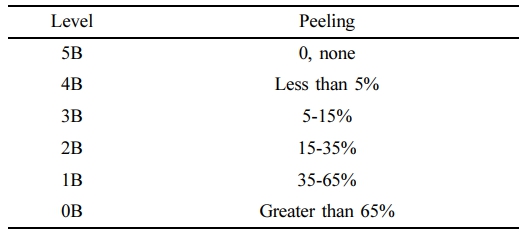Cross-Cut 시험의 정량화를 위해 ASTM D3359에서는 method B를 통해 접착등급을 0B에서 5B로 구분하여 평가하고 있으며 Table 2에 요약하였다.