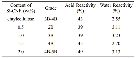 Table 2의 기준을 적용하면, 0.5 wt%의 경우 대략 2B, 1,0과 1.5 wt%의 경우 3B 또는 4B 수준이며, 2.0 wt%의 경우 4B-5B 정도를 보여주고 있다. 유해화학물질 센서가 현장에 적용되기 위해서는 4B 수준의 접착성능이 요구되며, Si-CNF 함량이 1.5 wt% 수준부터 4B를 만족하는 것으로 확인되었으며, 값을 Table 3에 요약하여 나타내었다. Figure 8은 Si-CNF 2 wt%와 에틸셀룰로오스의 Cross-cut 시험 결과를 나타낸 것으로 Si-CNF 2 wt%의 접착 성능(4B)이 에틸셀룰로오스(3B-4B)의 접착성능보다 우수함이 확인되었다. 유해화학물질 센서를 현장에 적용할 때 Table 3에 제시한 산성물질과의 반응성 이외에도 물 반응성(센서에 물을 도포하기 전과 후의 저항 값을 측정하여 저항 변화량을 확인하고, 식 (1)을 이용하여 반응성 계산)이 중요한 인자 중 하나이다. 물 반응성이 중요한 이유는 공기중의 습기 또는 청소 수 등에 의해 센서가 작동하지 않아야 하기 때문이다. Table 3에서 에틸셀룰로오스의 물 반응성은 2.55% 수준이며, Si-CNF의 경우 물 반응성이 2.70-3.23 수준으로 에틸셀룰로오스 대비 다소 높은 수준이나 반응성이 산물질과의 반응성 대비 매우 낮은 수준으로 감도 조정을 통해 물반응성을 배제시키는데 큰 문제가 없을 것으로 판단된다.