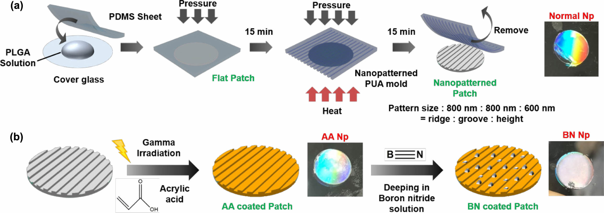 시약 및 재료. 나노패턴을 식각하기 위해 실리콘 웨이퍼 마스터(나노종합기술원, 한국), polyurethane acrylate(PUA; MINS 301 RM, 미뉴타텍, 한국)와 polydimethylsiloxane (PDMS; Sylgard184, Dow Corning, 미국)이 사용되었다. 나노패턴이 식각된 패치를 제조하기 위해서 생체적합성 및 생분해성을 가지는 PLGA(Mw 120000 Da, Evonik, 미국)와 용매로 chloroform (대정, 한국)이 사용되었다. BN(Sigma-Aldrich, 미국)을 코팅하기 위해서 acrylic acid(AAc; Sigma-Aldrich, 미국)을 구입하여 사용하였다.