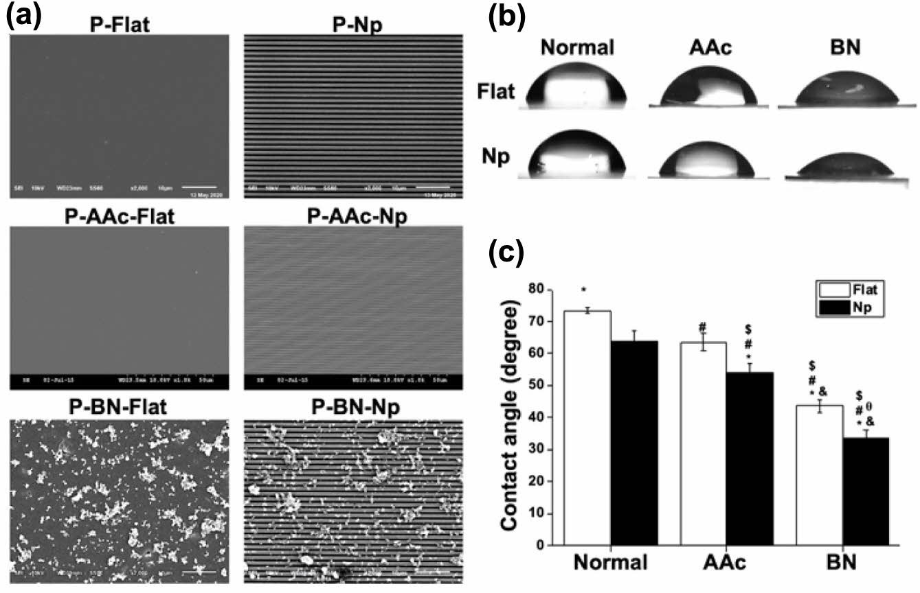 표면개질된 P-Flat 및 P-Np 지지체의 표면분석. SDC와 CFL에 의해 식각된 PLGA 지지체에 AAc와 BN 코팅에 의해 표면개질된 지지체들의 표면을 주사 전자 현미경을 이용해 촬영하여 비교하였다(Figure 2(a)). 패턴이 식각되지 않은 P-flat 그룹의 경우 평평한 형태를 보여주는 반면, 패턴이 식각된 P-Np 그룹은 그루브와 릿지의 형태가 반복되는 명확한 패턴이 표면에 식각되어져 있음을 확인하였다. AAc가 그라프트된 패턴이 식각되지 않은 P-Flat(P-AAc-Flat) 및 패턴이 식각된 P-Np(P-AAc-Np) 그룹은 AAc 그라프트 과정에 의해 두 지지체 표면의 형태적 변화가 유도되었는지 확인하였으며, TBO 염색 및 정량을 통해 AAc가 실제로 그라프팅되었는지 확인하였다. 주사 전자 현미경으로 확인했을 때, 두 그룹 모두 전체적인 구조적 변화는 관찰되지 않았으며, 더불어 TBO 염색, 정량 결과 역시 AAc 농도에 따라 지지체 표면에서 용출되는 TBO의 양 증가하여 지지체 표면에 AAc가 그라프트된 것을 확인할 수 있었다(Figure S1). 또한 BN이 코팅된 패턴이 식각되지 않은 P-flat(P-BN-flat) 및 패턴이 식각된 P-Np(P-BN-Np) 그룹은 지지체 표면에 나노스케일의 BN 입자들이 표면의 형태 변화 및 훼손 없이 잘 코팅되어져 있음을 확인하였다.