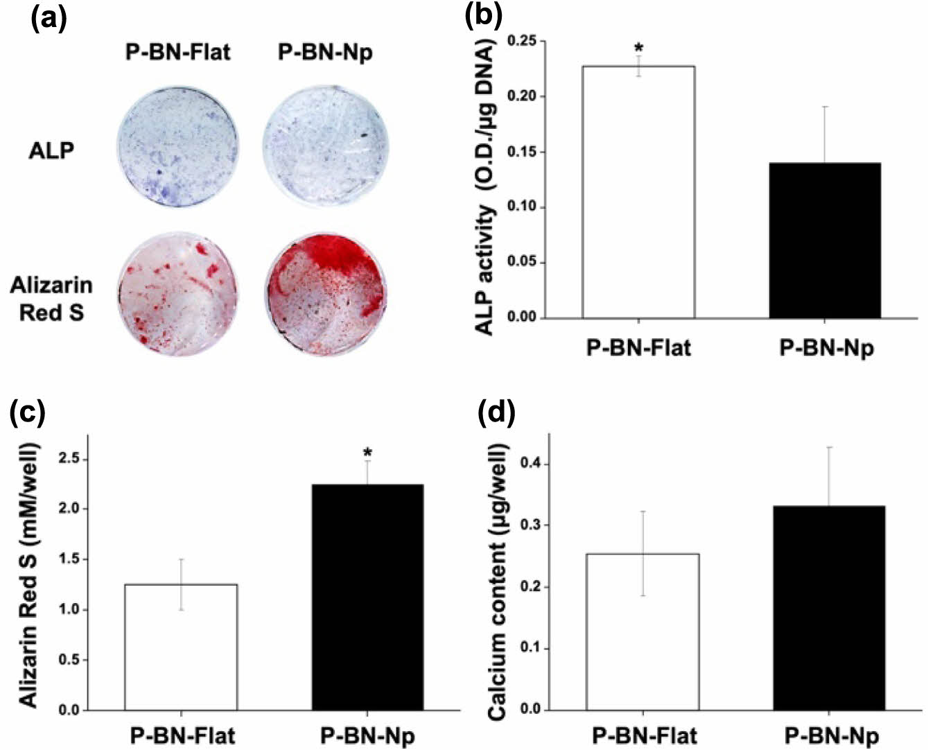 In vitro osteogenic differentiation tests on P-BN-Flat and P-BN-Np patches: (a) ALP and ARS staining of osteoblasts cultured on P-BN-Flat and P-BN-Np patches for 4 weeks. Quantification results of (b) ALP activity; (c) ARS; (d) calcium contents on PBN-Flat and P-BN-Np patches after 4 weeks (*p < 0.05).