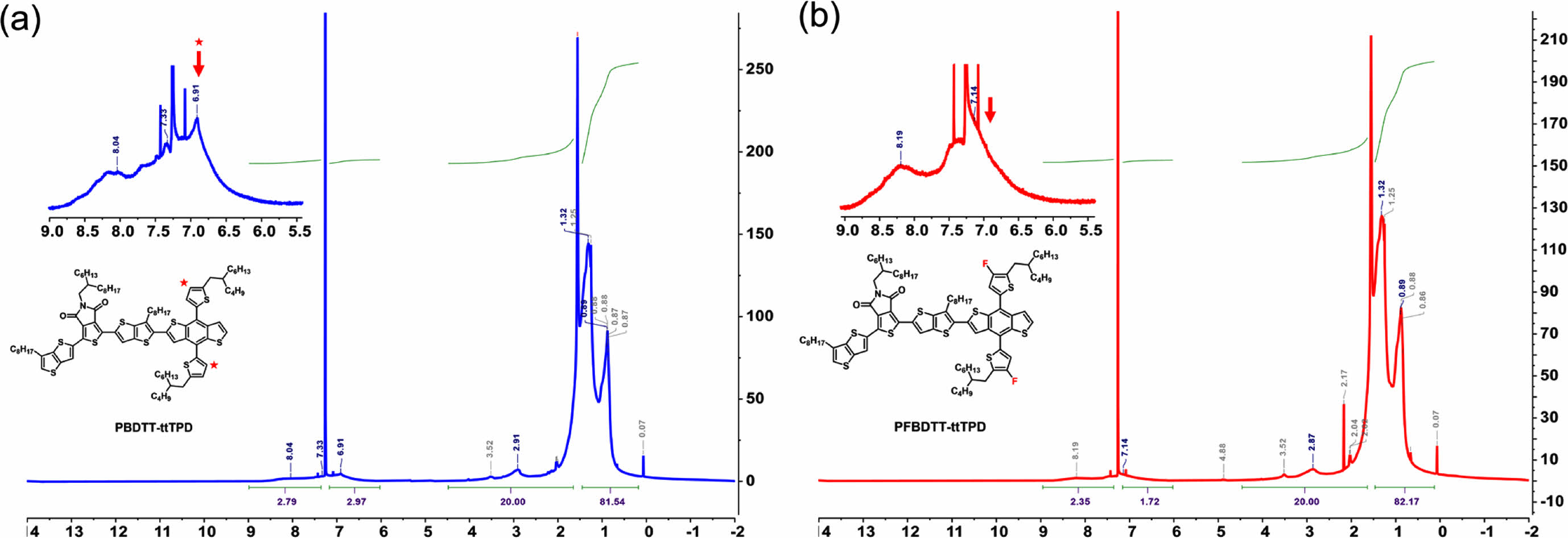 Figure 1 600 MHz 1H NMR spectrum of (a) PBDTT-ttTPD; (b) PFBDTT-ttTPD in CDCl3. |