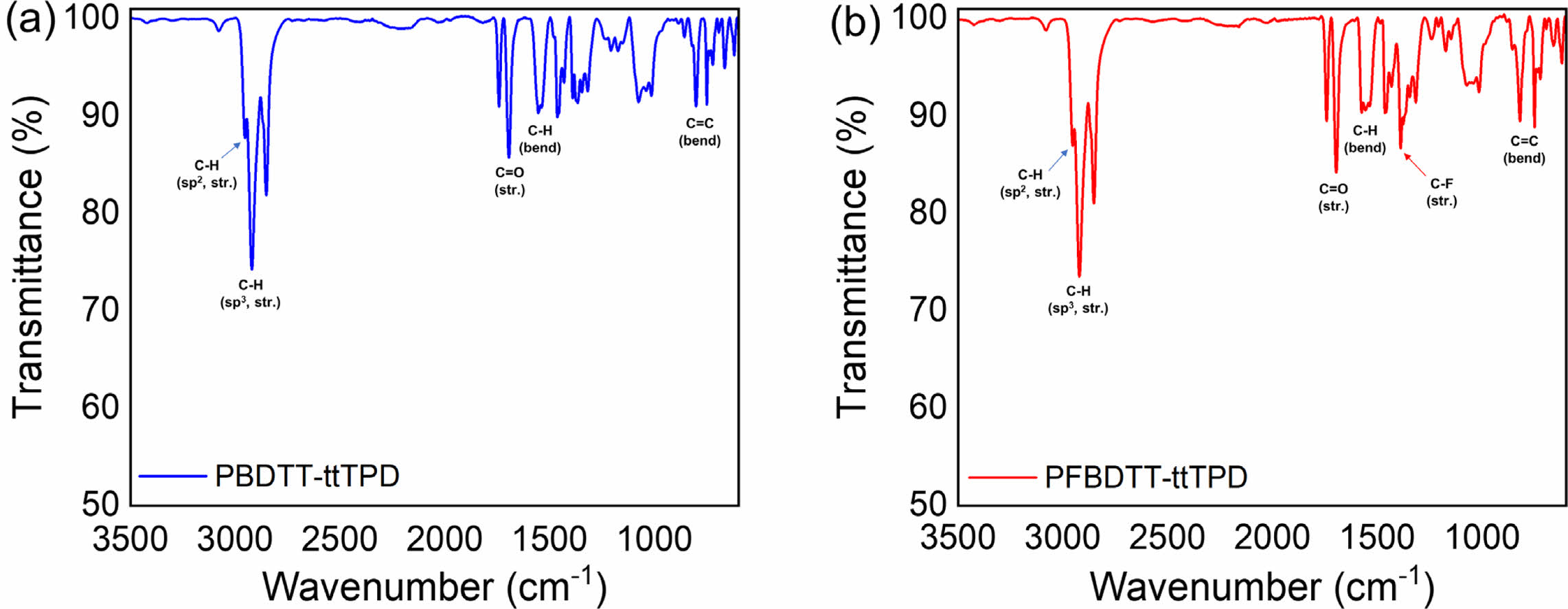 고분자 구조 분석. PBDTT-ttTPD와 PFBDTT-ttTPD의 구조를 분석하기 위해 FT-NMR에 CDCl3를 용매로 하여 측정하고, 그 결과를 Figure 1에 나타내었다. 높은 장(upfield)에서는 PBDTT-ttTPD와 PFBDTT-ttTPD의 TT, TPD, BDT의 알킬사슬의 수소가 3.57-3.38, 3.23-2.80, 2.24-0.60 ppm 영역과 3.62-3.38, 3.28-2.65, 2.22-0.60 ppm 영역에서 각각 나타나는 것을 확인하였다. 반면 PBDTT-ttTPD의 BDTT와 ttTPD를 포함한 방향족 고리의 수소는 8.69-6.82 ppm 영역에서 넓게 나타났고 PFBDTT-ttTPD에서는 해당 피크가 8.78-7.02 ppm 영역에서 비교적 좁게 나타났다. PBDTT-ttTPD는 PFBDTT-ttTPD와는 다르게 6.91 ppm 영역에서 하나의 피크가 더 갈라짐을 볼 수 있는데, 이는 PBDTT-ttTPD에서 BDTT의 싸이오펜 곁사슬의 수소에 의해서 나타나는 피크이며, PFBDTT-ttTPD에서는 관찰되지 않기 때문에 불소 치환이 성공적으로 이루어졌음을 확인하였다. 또한 FTIR을 통해 합성한 두 고분자의 작용기와 구조적 특성을 확인하였다(Figure 2). PBDTT-ttTPD와 PFBDTT-ttTPD 모두 3000-2840 cm-1 영역에서 sp3와 sp2 혼성 탄화수소의 강한 C-H 신축(stretching) 진동 피크를 관찰하였고, 1745-1697 cm-1 영역에서는 TPD의 이마이드(imide)에 해당하는 C=O 신축진동 피크를 확인할 수 있었다. 뿐만 아니라 PBDTT-ttTPD, PFBDTT-ttTPD 모두 850-600 cm-1의 지문(fingerprint)영역에서는 C=C bending을 나타내는 등 PBDTT-ttTPD와 PFBDTT-ttTPD는 전 영역에서 비슷한 피크를 확인하였으나, 1400-1000 cm-1에서는 불소로 인한 차이를 보였다. 불소가 치환되지 않은 PBDTT-ttTPD는 1389 cm-1에서 피크가 나타나지 않았으며, PFBDTT-ttTPD는 해당 영역에서 불소 치환으로 인한 얇고 강한 C-F 신축 피크가 나타남에 따라 PFBDTT-ttTPD의 합성 과정에서 불소가 성공적으로 치환되었음을 확인하였다.