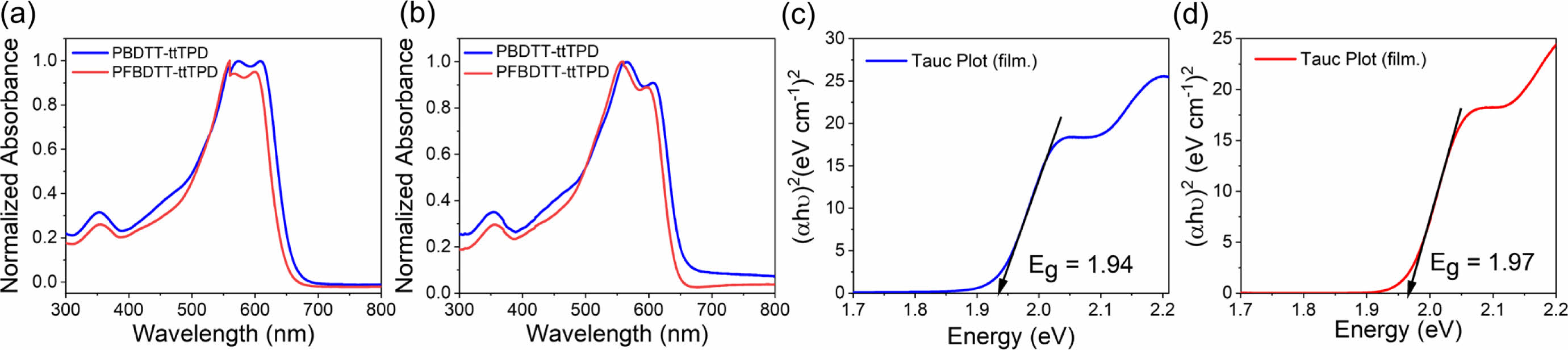 Figure 4 Normalized UV-Vis-NIR absorption spectra of PBDTT-ttTPD and PFBDTT-ttTPD in chloroform: (a) solution; (b) film. Tauc plot of (c) PBDTT-ttTPD; (d) PFBDTT-ttTPD. |