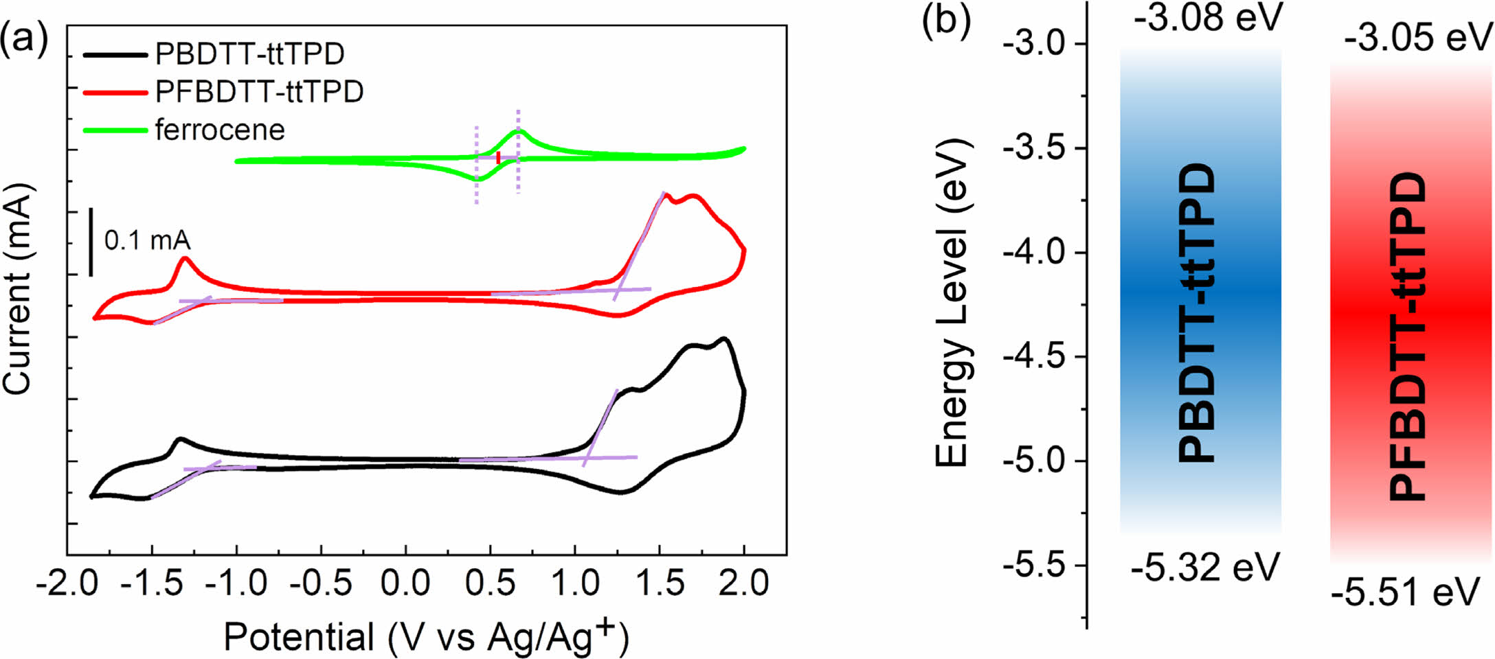 Figure 5 (a) Electrochemical properties of PBDTT-ttTPD and PFBDTT-ttTPD; (b) energy diagram of PBDTT-ttTPD and PFBDTT-ttTPD. |