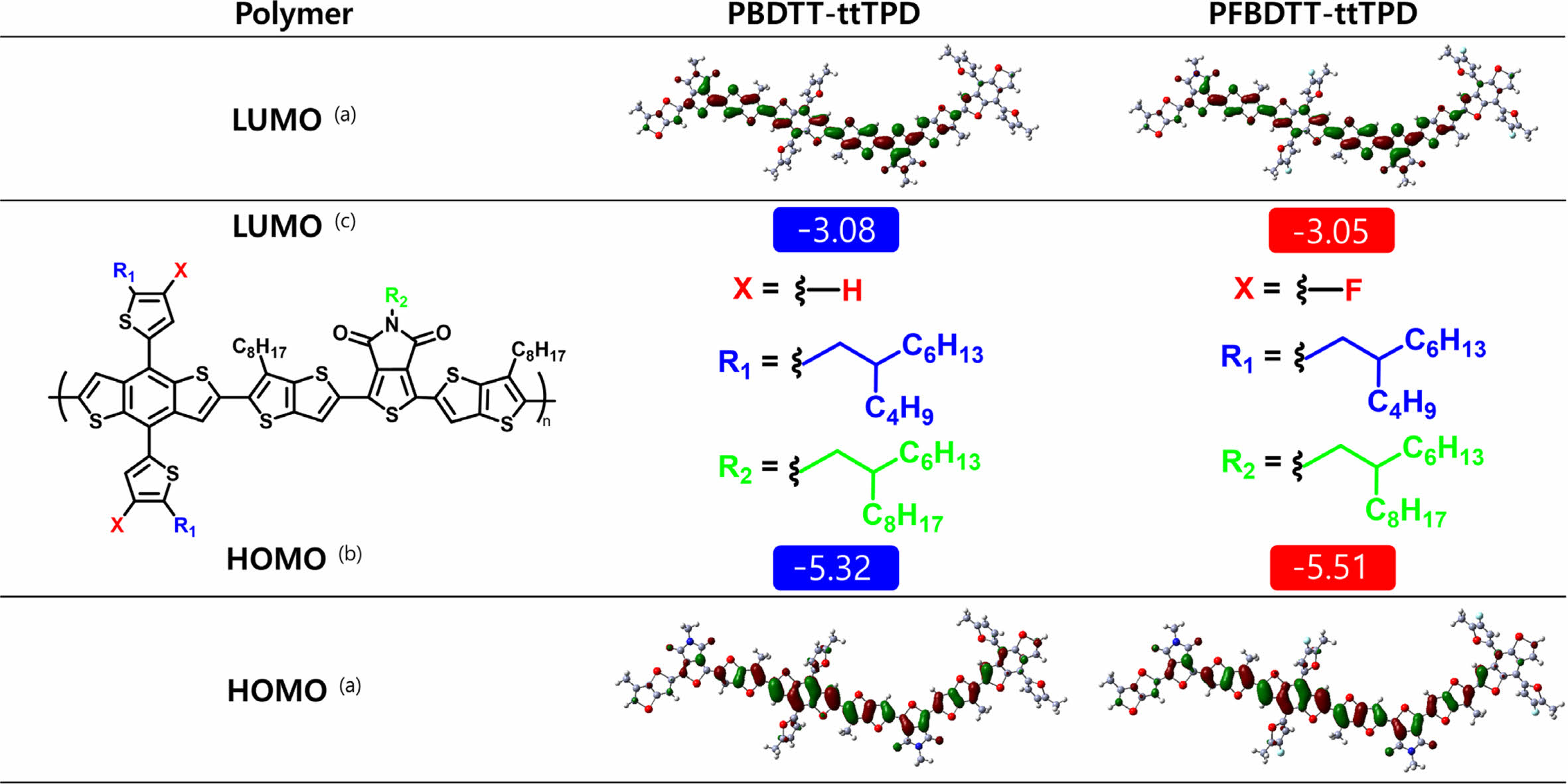실험을 통해 도출한 PBDTT-ttTPD와 PFBDTT-ttTPD의 다양한 결과는 밀도 범함수 이론(density functional theory, DFT)으로 구한 이론적인 수치와 경향성이 유사함을 확인할 수 있었다. 본 연구를 통한 결과들을 바탕으로 향후 유기반도체 분야에 새롭게 활용되길 기대한다.