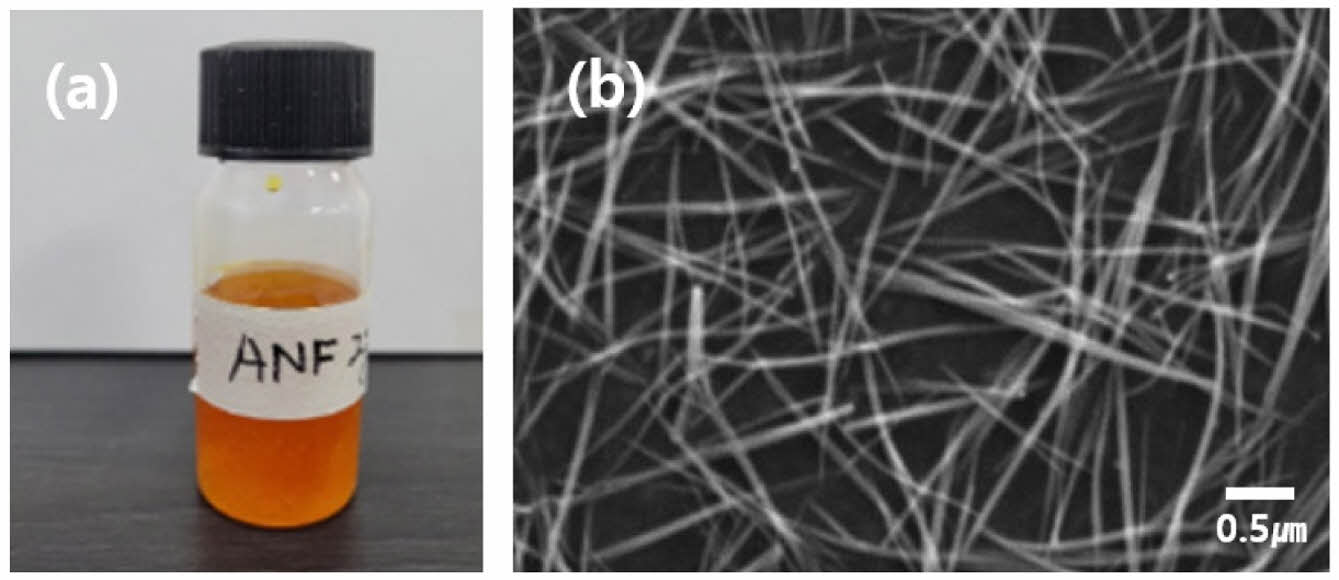 Figure 1 (a) ANF Solution; (b) SEM image of ANF |