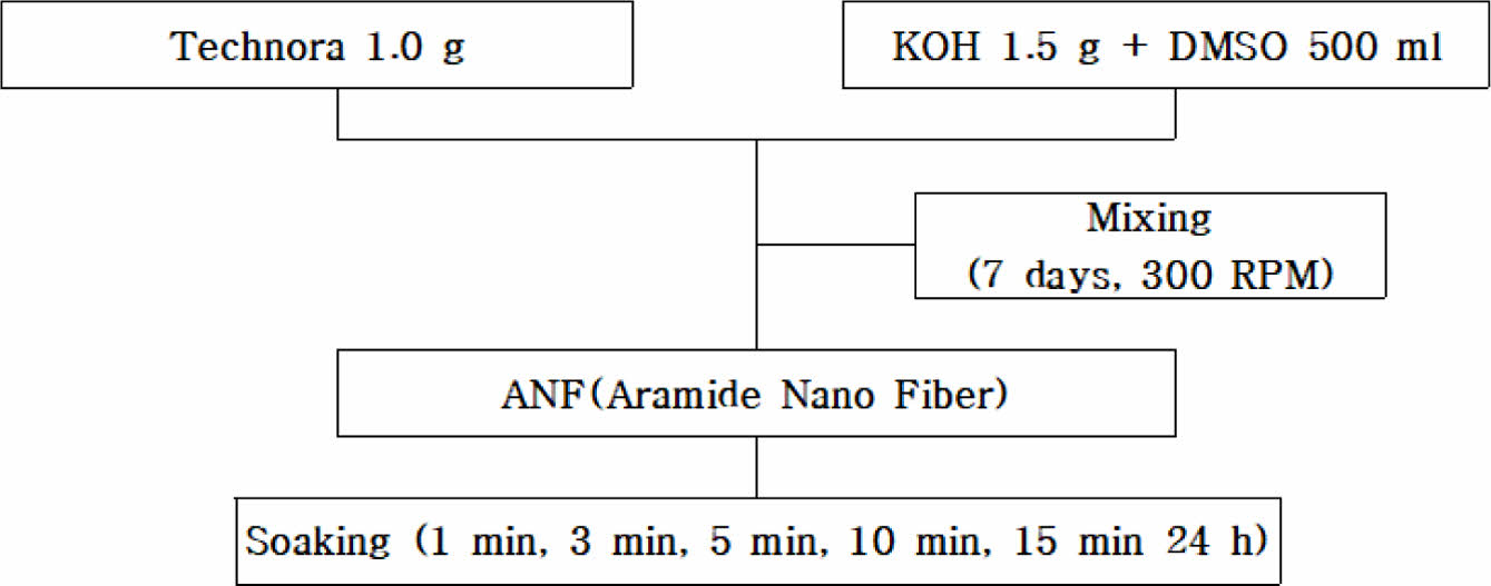 Aramide nano fiber(ANF) 제조 및 코팅. 본 실험에서 사용된 아라미드는 Technora(Teijin, Japan) 원사를 사용하였다. 제조 과정에서 발생할 수 있는 오염물질을 제거하기 위하여 에탄올로 6시간 이상 초음파 세척한 후 60 ℃에서 6시간 동안 건조시켰다. 아라미드 원사의 표면 개질을 위해 KOH(Aldrich, USA)와 DMSO(Dimethyl Sulfoxide, Aldrich, USA)를 사용하였다. 1 g의 Technora 원사와 KOH 1.5 g을 DMSO 500 mL에 첨가한 후 300 rpm으로 7일간 교반시켜 Figure 1과 같이 평균 직경이 100 nm 정도의 공중합 아라미드 섬유가 녹아 있는 ANF 용액을 제조하였다. 제조된 ANF 용액 500 mL에 1 g의 Technora 원사를 침지시켜 Technora 원사표면을 코팅하였으며 공정은 Figure 2와 같다.