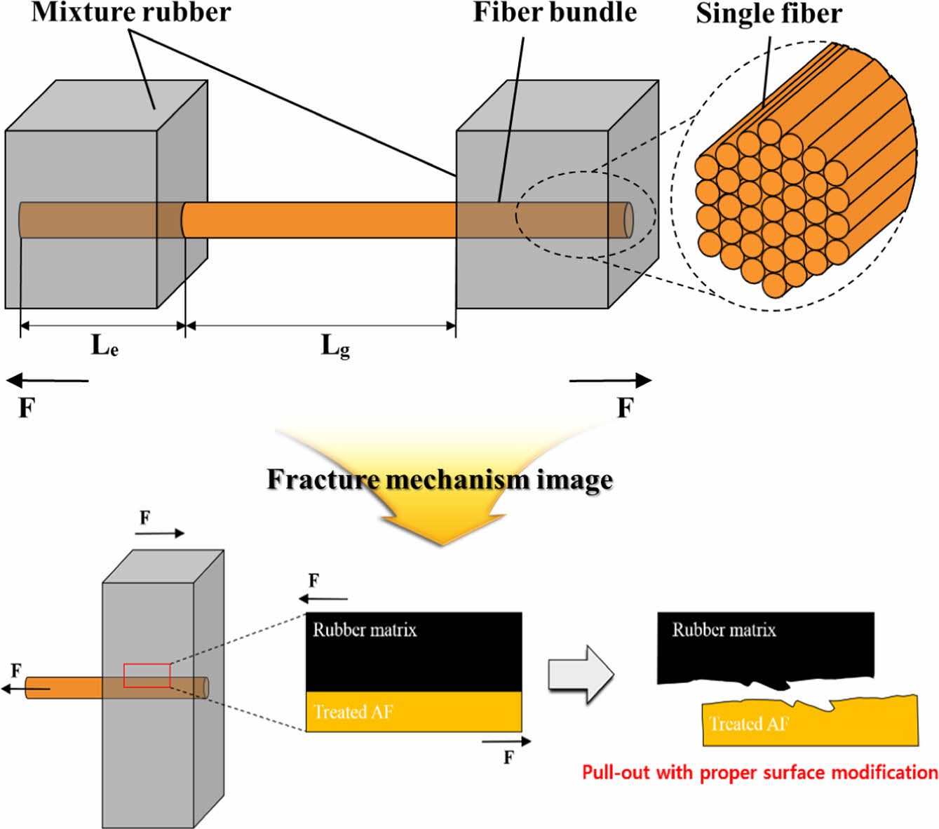 이처럼 공중합 아라미드 섬유는 인장강도 및 내구성이 우수한 특성이 있지만 고무와 접착시켰을 때 접착성능이 매우 떨어지는 단점이 있으며 고무와 접착하여 제품을 사용하였을 경우 접착력이 약해 제품 고장의 원인이 되기도 한다. 이에 아라미드 섬유를 MRG 등에 적용하기 위해서는 섬유표면을 처리하여 고무와의 계면에서 접착성 등을 향상시키는 것이 필요하다.10-12 섬유는 극성 및 고탄성율로서 비극성 및 저탄성계수인 고무와 반대되는 특징으로 인해 두가지 물질을 접착 시켜주기 위해서는 섬유 표면에 고무에 쉽게 접착할 수 있는 표면처리가 필요하다.13-15