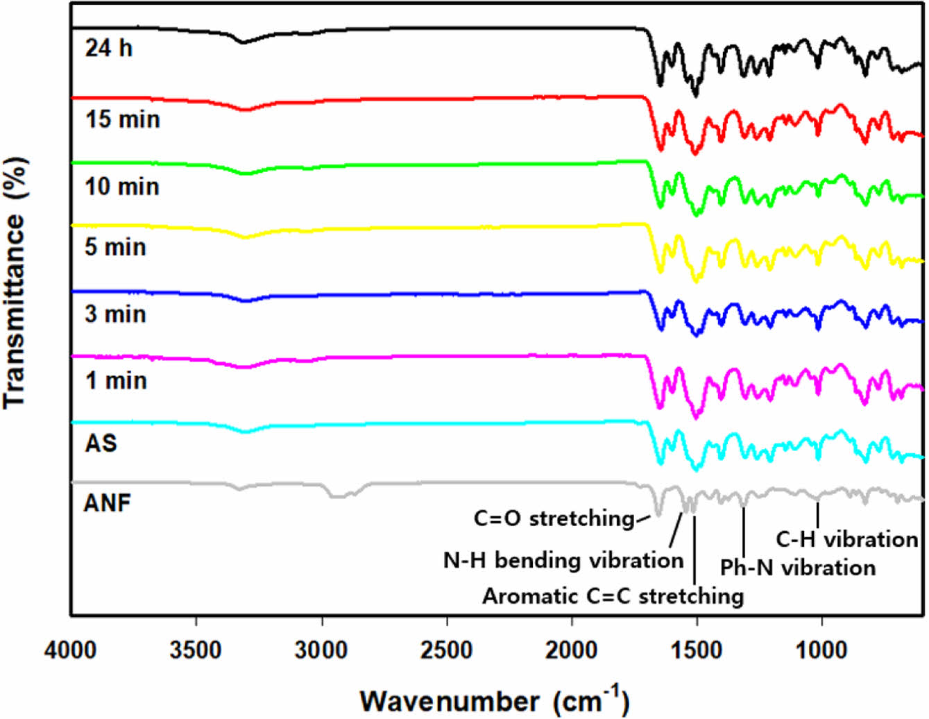 ANF 용액 침지 시간에 따른 공중합 아라미드의 화학조성 변화 분석: FTIR. ANF 용액에 침지 시간에 따른 공중합 아라미드 FTIR spectra를 Figure 4에 나타내었다. ANF의 FTIR 스펙트럼을 통해 Technora 원사가 개질되어 용액에 분산되어 있음을 알 수 있었다. 또한 24시간 동안 침지시켜도 FTIR 스펙트럼을 통해 화학적 조성 변형이 나타나지 않았음을 확인하였으며 이를 통해 공중합 아라미드 섬유의 고유 특성은 변하지 않음을 알 수 있었다. ANF로 화학적 개질처리시 FTIR 스펙트럼은 본질적으로 변하지 않는 구조를 나타내지만 C=O(1639 cm-1) 및 N-H(1546 cm-1)에 해당하는 피크가 변동함을 확인하였다. 이러한 결과는 ANF에 아민 및 카르복실산과 같은 작용기들이 있어 용해과정을 통해 공중합 아라미드에 영향을 미치는 것을 나타낸다. 또한 이러한 작용기들은 섬유 개질 공정시 공중합 아라미드 섬유와 복합재료가 공유 및 수소결합을 형성할 가능성도 있다고 볼 수 있다.