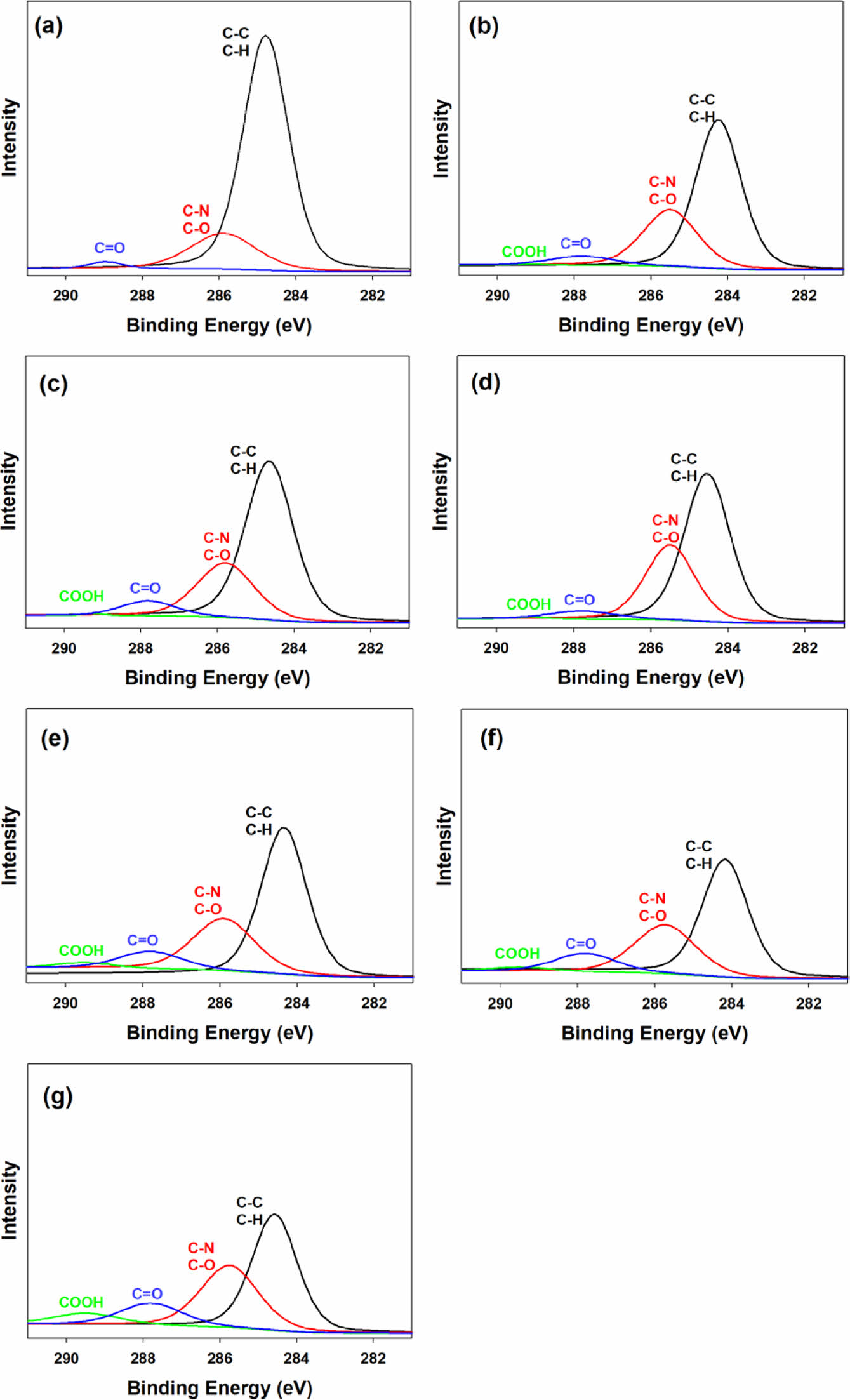 Figure 5 C1s peak in the XPS spectrum of ANF coated aramid fibers: (a) 0 min; (b) 1 min; (c) 3 min; (d) 5 min; (e) 10 min; (f) 15 min; (g) 24 h. |