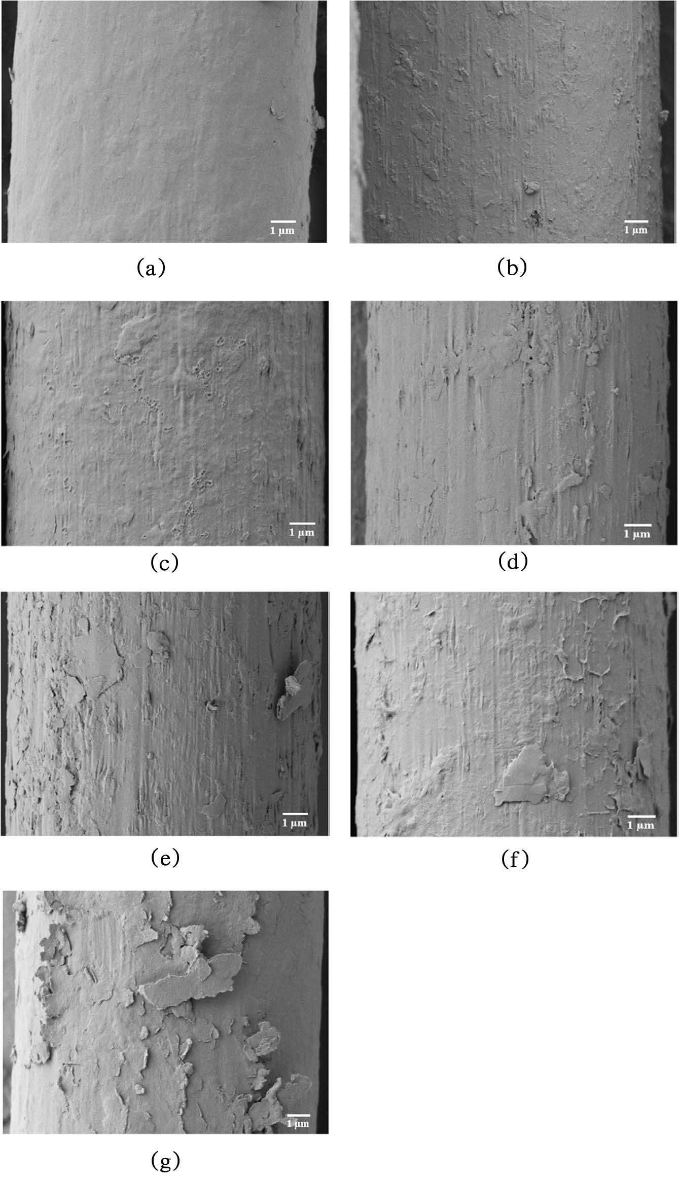 Figure 6 Scanning electron microscopy of ANF coated aramid fibers for surface roughness comparison: (a) 0 min; (b) 1 min; (c) 3 min; (d) 5 min; (e) 10 min; (f) 15 min; (g) 24 h. |