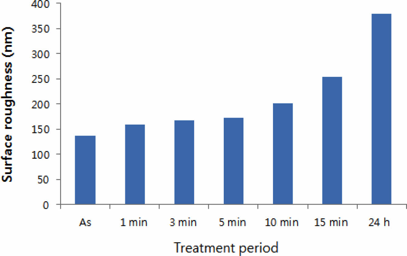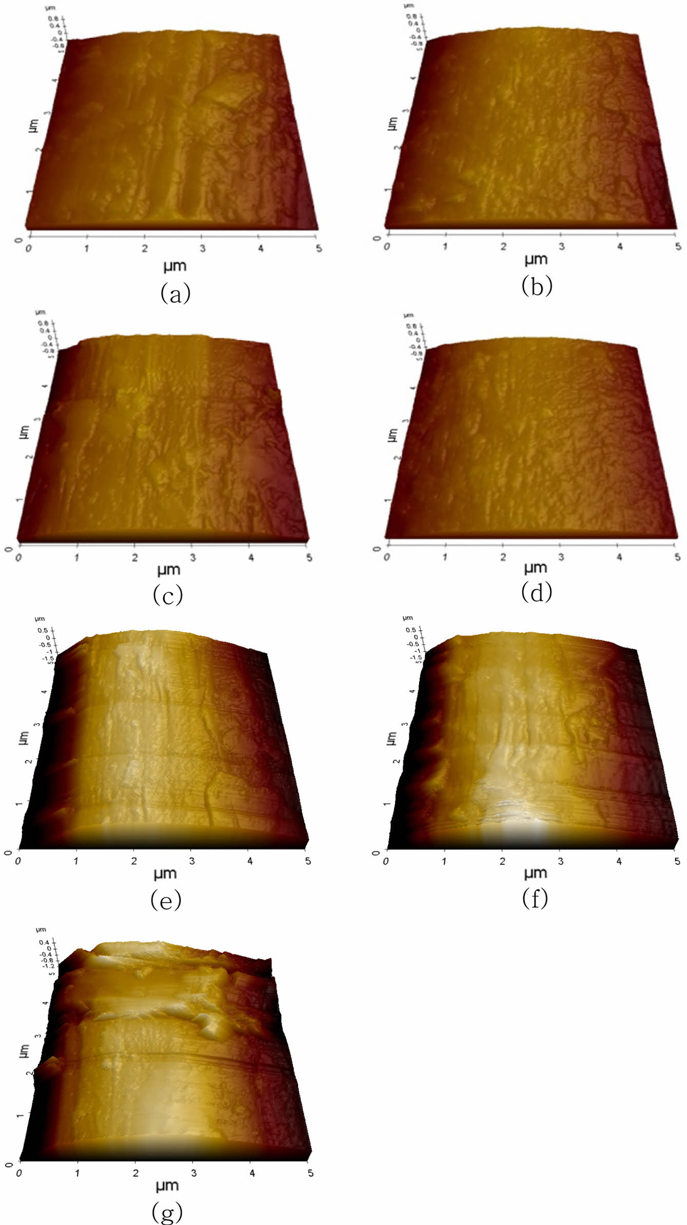 Figure 7은 ANF 용액에 코팅된 공중합 아라미드 표면을 좀 더 입체적으로 확인하기 위하여 ANF 용액에 침지 시간에 따른 공중합 아라미드 표면의 AFM 이미지이다. SEM 이미지와 마찬가지로 침지에 의하여 표면의 코팅층이 형성 및 표면 거칠기가 상승하는 것을 확인할 수 있었다.