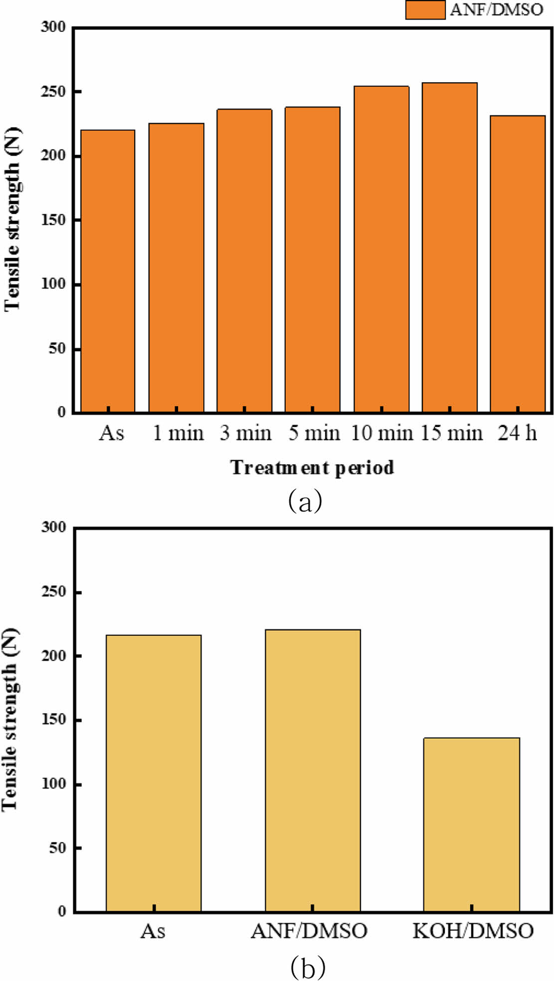 Figure 9 (a) Tensile strength of treated fibers for various durations; (b) tensile strength of treated fibers in ANF/DMSO and KOH/DMSO solutions for 24 h. |