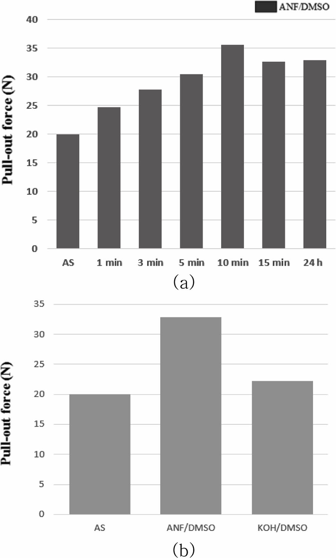 ANF 용액 침지 시간에 따른 공중합 아라미드의 계면 특성 분석. ANF 용액에 침지 시간에 따른 공중합 아라미드와 고무 복합재료의 접착강도는 Figure 10(a)에 나타내었다. 제조한 ANF 용액에 1분간 침지하였을 때는 23.7% 증가하였으며 3분간 침지하였을 때는 39.0%, 10분간 침지하였을 때는 77.7%로 접착강도 값이 증가하였다. 이처럼 침지시간 10분까지는 침지시간이 증가함에 따라 공중합 아라미드와 고무 복합재료의 접착강도는 증가하는 것으로 나타났다. 이는 ANF 층이 아라미드 섬유와 고무 컴파운드 사이의 결합을 유도하는 접착제의 역할로써 섬유와 고무 사이의 물리적·화학적 결합을 증가시켜 그에 따라 접착강도가 향상 된 것으로 보인다. 그러나 침지시간이 10분을 경과한 후부터는 접착강도가 증가하지 않고 감소하였으며 이는 어느 적정량 이상에서 처리하게 되면 섬유표면의 코팅층이 두꺼워져 코팅층에서 파괴가 일어난 것으로 사료된다. 또한 KOH와의 비교분석을 위해 24시간 동안 ANF/DMSO 및 KOH/DMSO 용액에 침지 후 접착강도를 측정하였으며 Figure 10(b)에 나타내었다. KOH/DMSO 용액에 24시간 동안 침지한 공중합 아라미드 섬유의 접착강도는 10.9% 증가하였다. 제조한 ANF 용액에 장시간 침지하여도 우수한 접착성능을 나타내었지만 아라미드의 접착성능을 향상시키기 위해 많이 사용되는 KOH 용액의 경우 장시간 침지하였을 때는 접착성능이 소폭 증가하였다. 이는 인장강도와 같이 미반응된 KOH가 가수분해를 유도하고 공중합 아라미드 섬유의 열화 및 피브릴화를 일으켜서 물리적 성능이 감소한 영향때문인 것으로 생각되며 ANF 용액을 통한 공중합 아라미드의 표면개질이 KOH 용액만을 통한 표면개질 방법보다 우수한 접착성능 나타내는 것을 확인하였다.