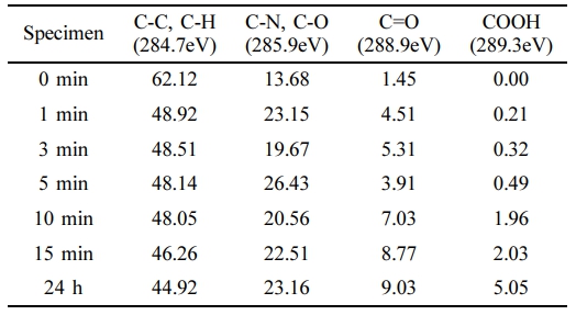 ANF 용액 침지 시간에 따른 공중합 아라미드의 화학조성 변화 분석: XPS. Figure 5는 ANF 용액에 침지 시간에 따른 공중합 아라미드의 XPS 분석결과를 나타낸 그래프이며 Table 1은 C1s의 XPS 데이터를 피팅(fitting)하여 나타내었다. 침지 전에는 C-OOH(카르복실기)가 없었지만 ANF 용액에 침지한 공중합 아라미드에서는 C-OOH(카르복실기)를 확인되었으며 침지시간이 증가할수록 C-OOH(카르복실기)의 조성비가 증가하는 것을 확인할 수 있었다. 공중합 아라미드에 새로운 관능기가 추가되고 카르복실기가 활성화됨에 따라 공중합 아라미드와 고무 사이의 높은 계면접착력을 가질 수 있을 것으로 판단된다.23