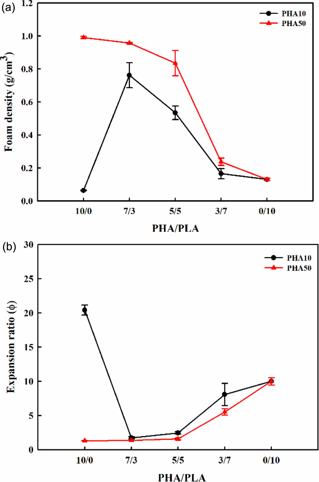Foam characteristics of PHA/PLA blend foams (foaming conditions: 130 ℃/90 bar): (a) foam density; (b) expansion ratio.