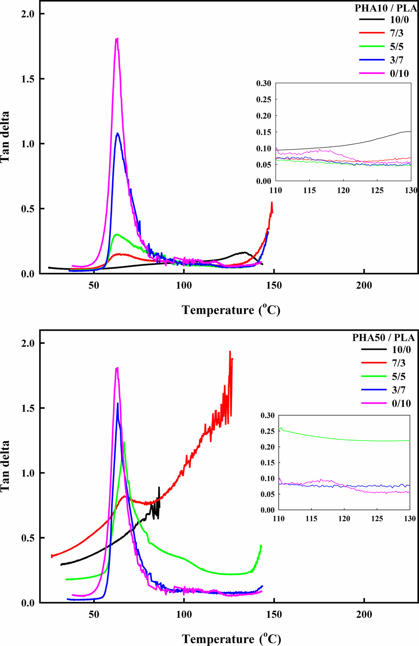 DMA thermograms of PHA/PLA blends: (a) PHA10/ PLA; (b) PHA50/PLA.