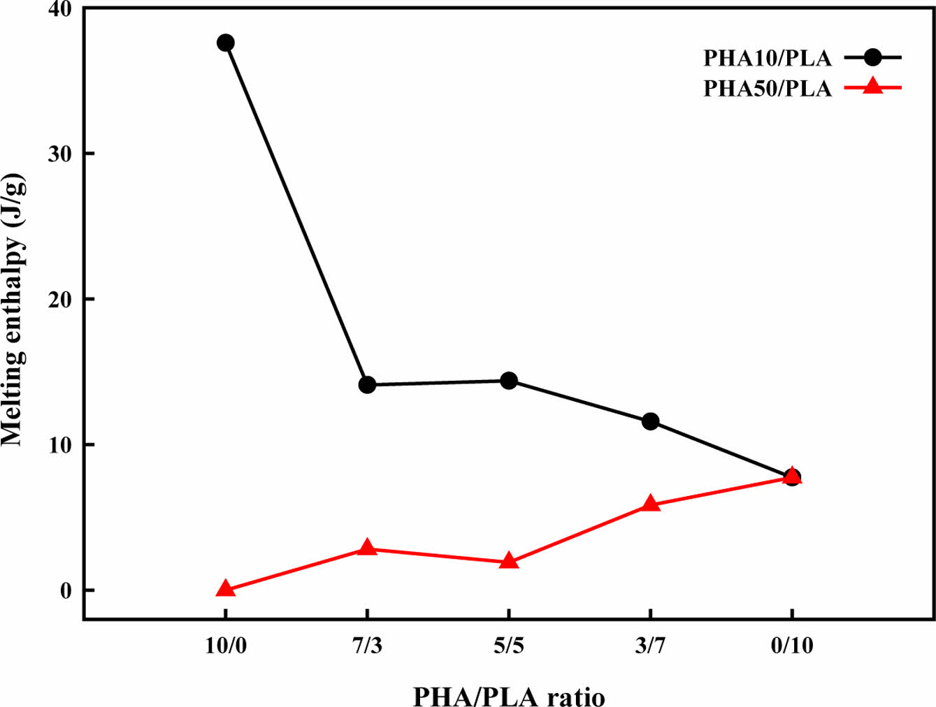 Effect of blending composition on relative crystallinity (melting enthalpy) PHA/PLA blends.
