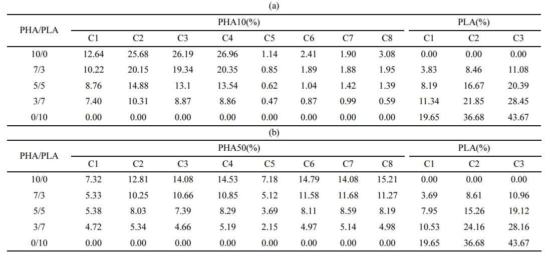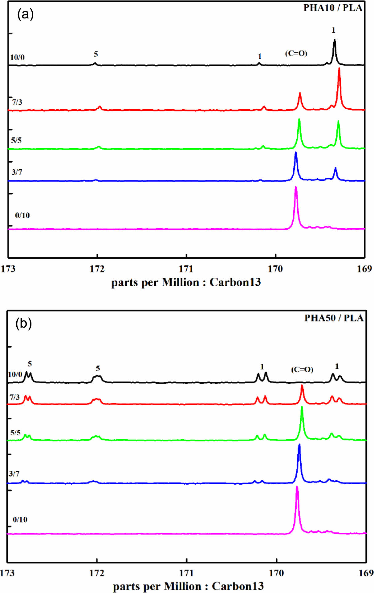 13C NMR Peak Aarea for PHA/PLA Blends: (a) PHA10/PLA; (b) PHA50/PLA