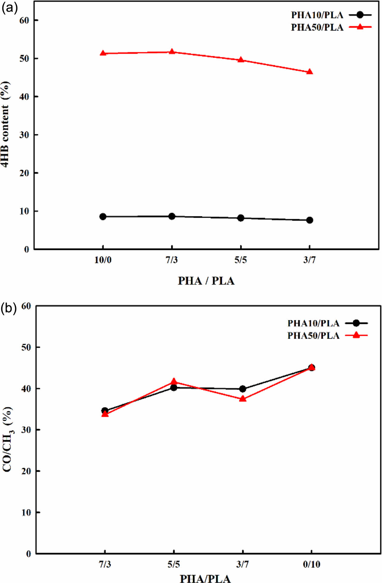 Chemical modification of PHA/PLA blends: (a) 4HB content; (b) CO/CH3 ratio.