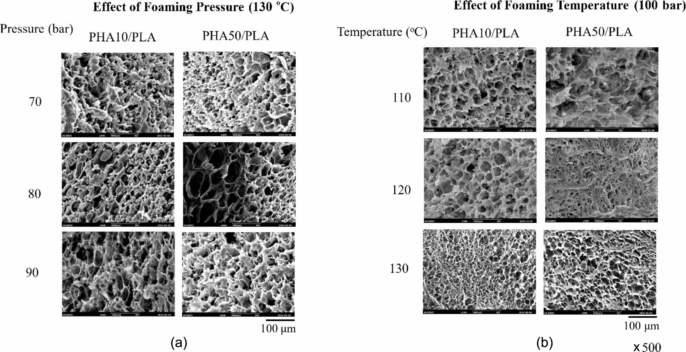 SEM micrographs of PHA/PLA(3/7) blend foams: (a) as function of foaming pressure (foaming temperature : 130 ℃); (b) as function of foaming temperature (foaming pressure : 100 bar).