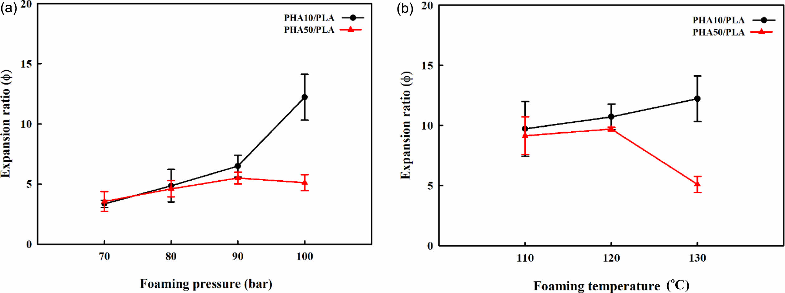 Effect of foaming conditions on expansion ratio of PHA/PLA blend foams: (a) effect of foaming pressure (foaming temperature: 130 ℃); (b) effect of foaming temperature (foaming pressure: 100 bar).