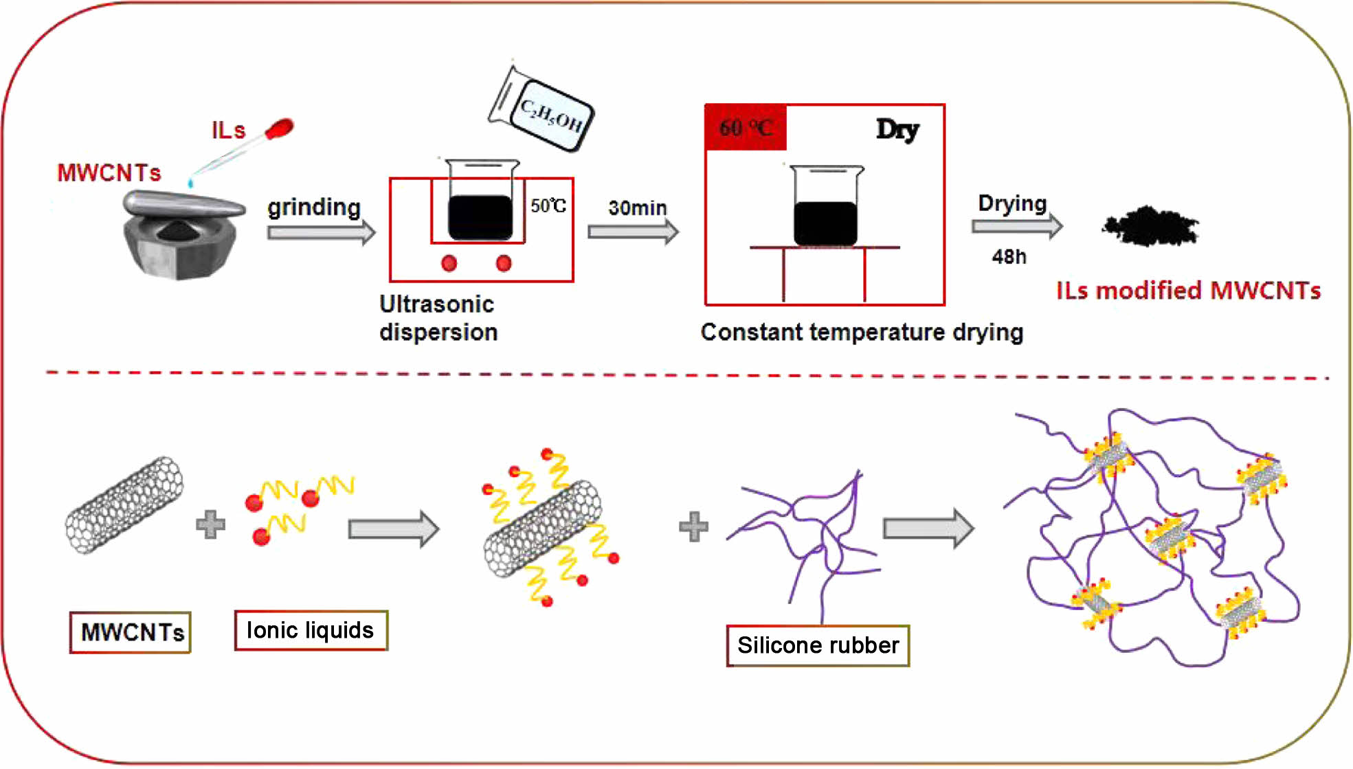In this paper, multi-walled carbon nanotubes (MWCNTs) were modified using ionic liquids (ILs), and silicone rubber/carbon nanotube composites were prepared. The surface of carbon nanotubes is coated with a layer of ionic liquid by non-covalent bond modification, and the van der Waals force between the carbon nanotubes is reduced to achieve the purpose of improving their dispersibility. The electrical conductivity of silicone rubber/carbon nanotube composites prepared by modified carbon nanotubes is improved. The dispersion of modified carbon nanotubes in silicone rubber matrix and the interface interaction between carbon nanotubes and silicone rubber are analyzed by rubber process analyzer and scanning electron microscopy (SEM) tests. The effects of modified carbon nanotubes on electrical conductivity, mechanical properties and electromagnetic shielding properties of silicone rubber composites were studied. The results show that the dispersion of carbon nanotubes in silicone rubber matrix is improved effectively through the modification of ionic liquid, the conductive property of the composite is improved, the electromagnetic wave reflection of the composite is increased, and the electromagnetic shielding efficiency of the composite is improved, and the shielding efficiency is up to 26 dB.