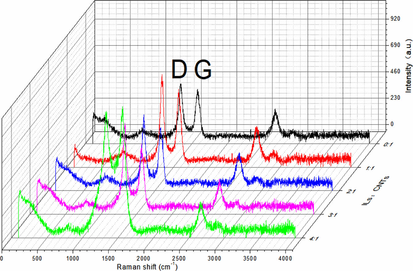 Raman Spectra of Composites. Raman spectra of CNTs before and after modification are shown in Figure 3. Similar to graphite, two strong peaks can be observed. The peak value around 1600 cm-1 comes from tangential vibration of carbon atoms, which is called G peak. The peak at about 1300 cm-1 is known as the D-peak, which is due to significant defects or disturbances in the nanostructure. For the modified CNTs, the D and G peaks shift to some extent, but no new peak is observed as opposed to that of the unmodified CNTs. The upward shift of the spectra is due to the cationic π bond interaction between the ionic liquid and the CNTs or the π-π interaction between the multi-wall of the CNTs. In summary, the modification method is a physical modification, and there is no chemical damage to CNTs.