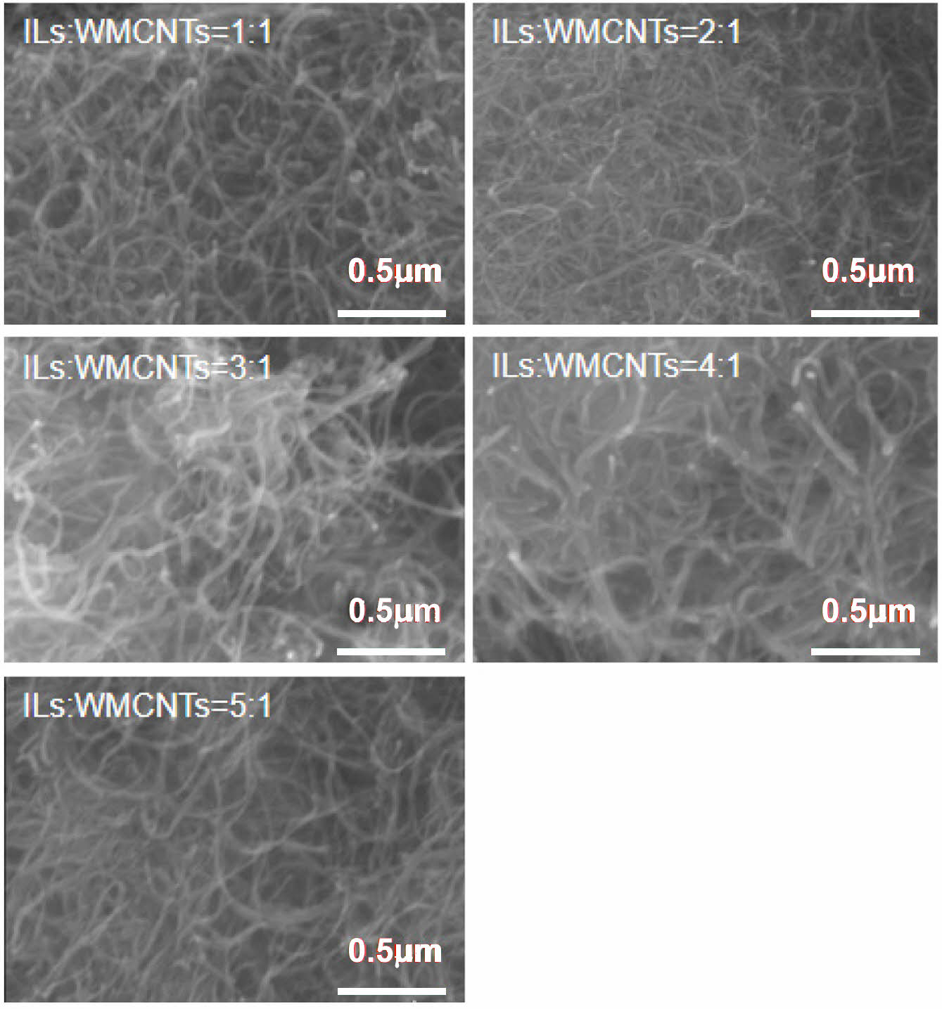Scanning Electron Microscopy of Composites. As shown in Figure 4, when the ratio of ionic liquid to CNTs is 1:1, the dispersion of CNTs is poor and obvious entanglement occurs, because the amount of ionic liquid is insufficient to completely disperse CNTs. When the ratio of ionic liquid to CNTs is 4:1, the dispersion of CNTs is obviously improved and entanglement is reduced. This is because the modification of CNTs by ionic liquid can effectively reduce the van der Waals force between CNTs, reduce the entanglement phenomenon of CNTs, and improve the dispersion of CNTs. Under the electron microscope, it can be clearly seen that with the increase of the proportion of ionic liquid, the dispersion of CNTs is enhanced, and the improvement of the dispersion of CNTs is the main reason for the good electrical conductivity of composites.