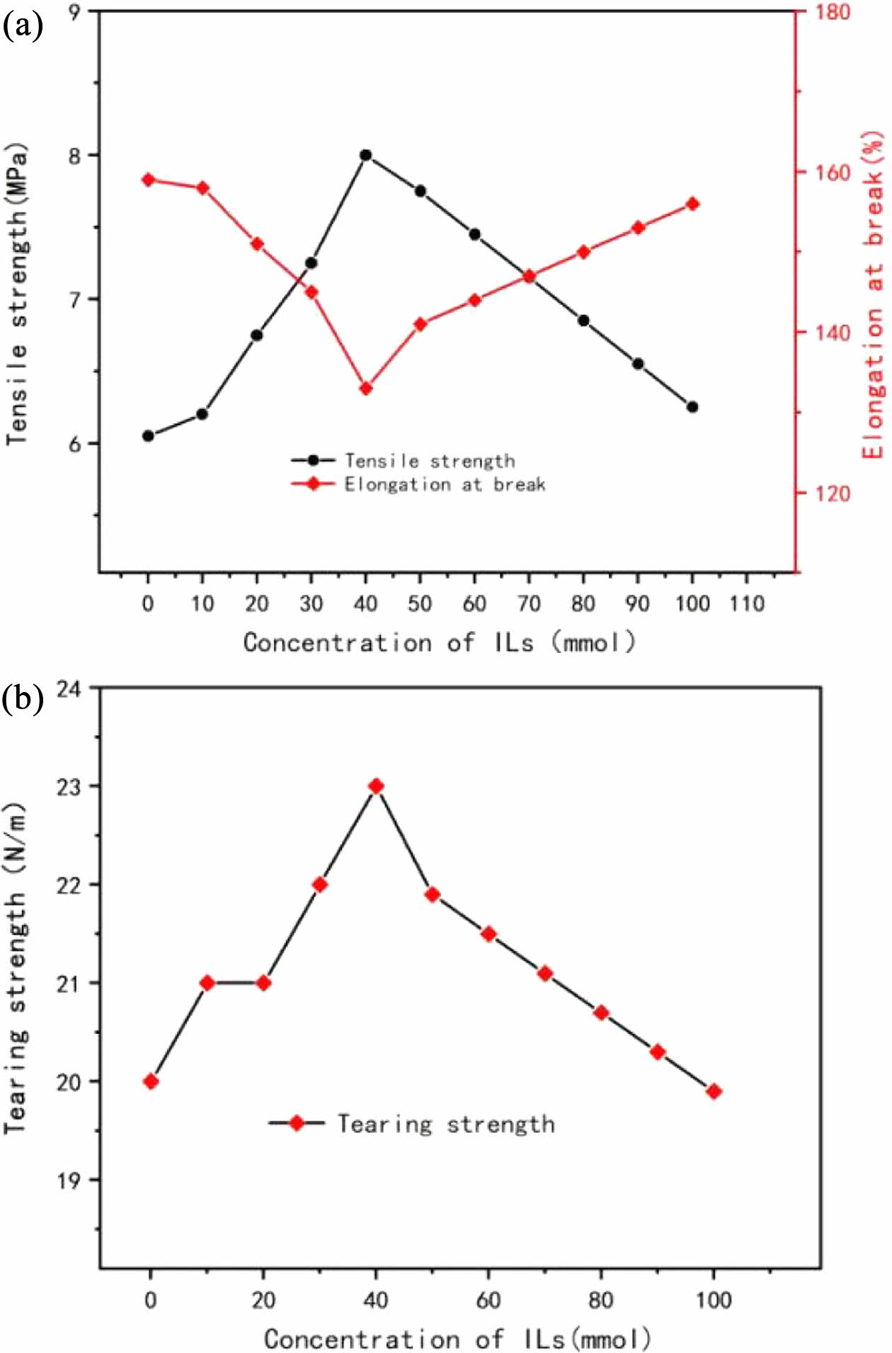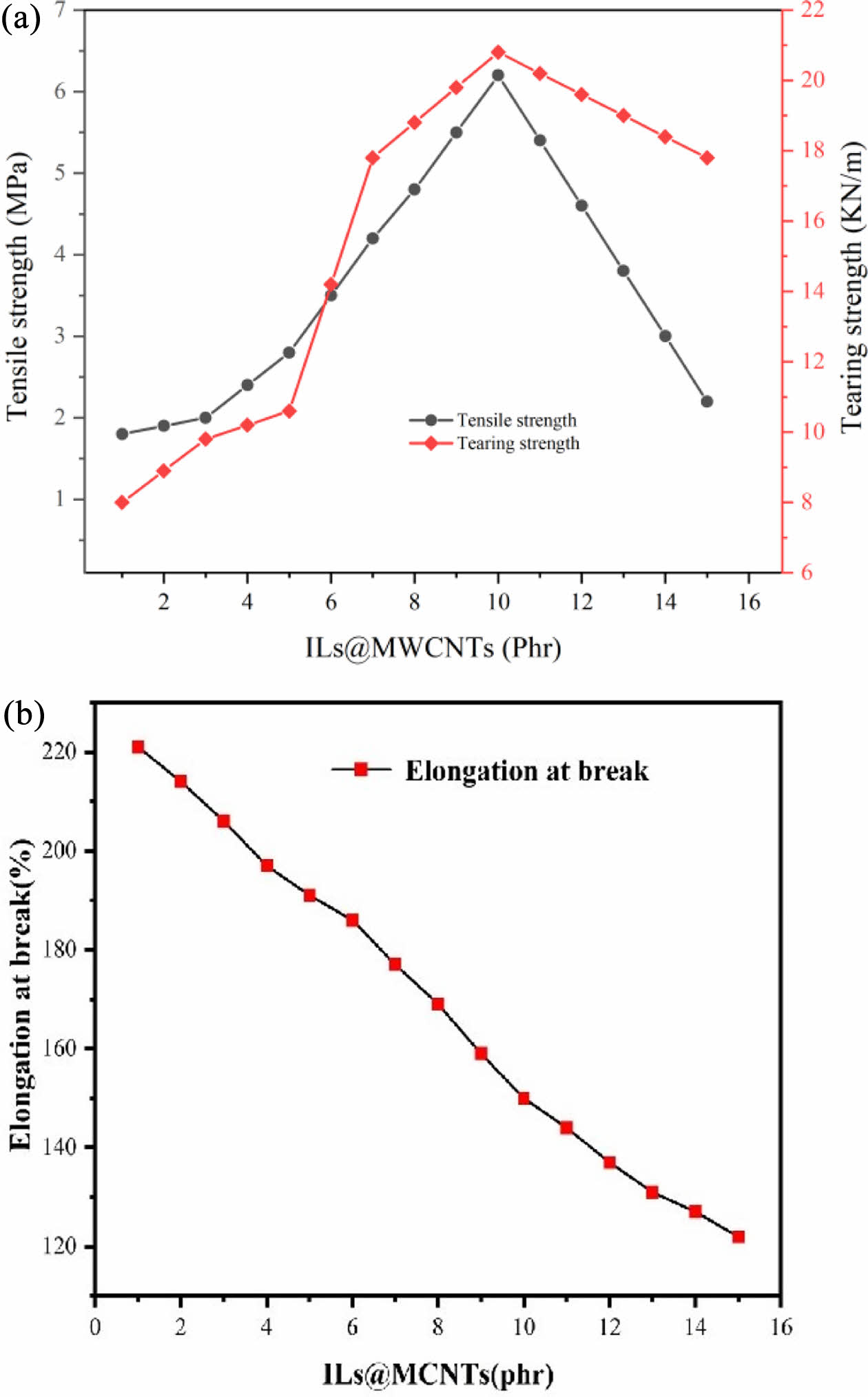 Effect of ILs filling on the mechanical properties of composites (MWCNTs = 10 phr): (a) tensile strength & elongation at break; (b) tearing strength.