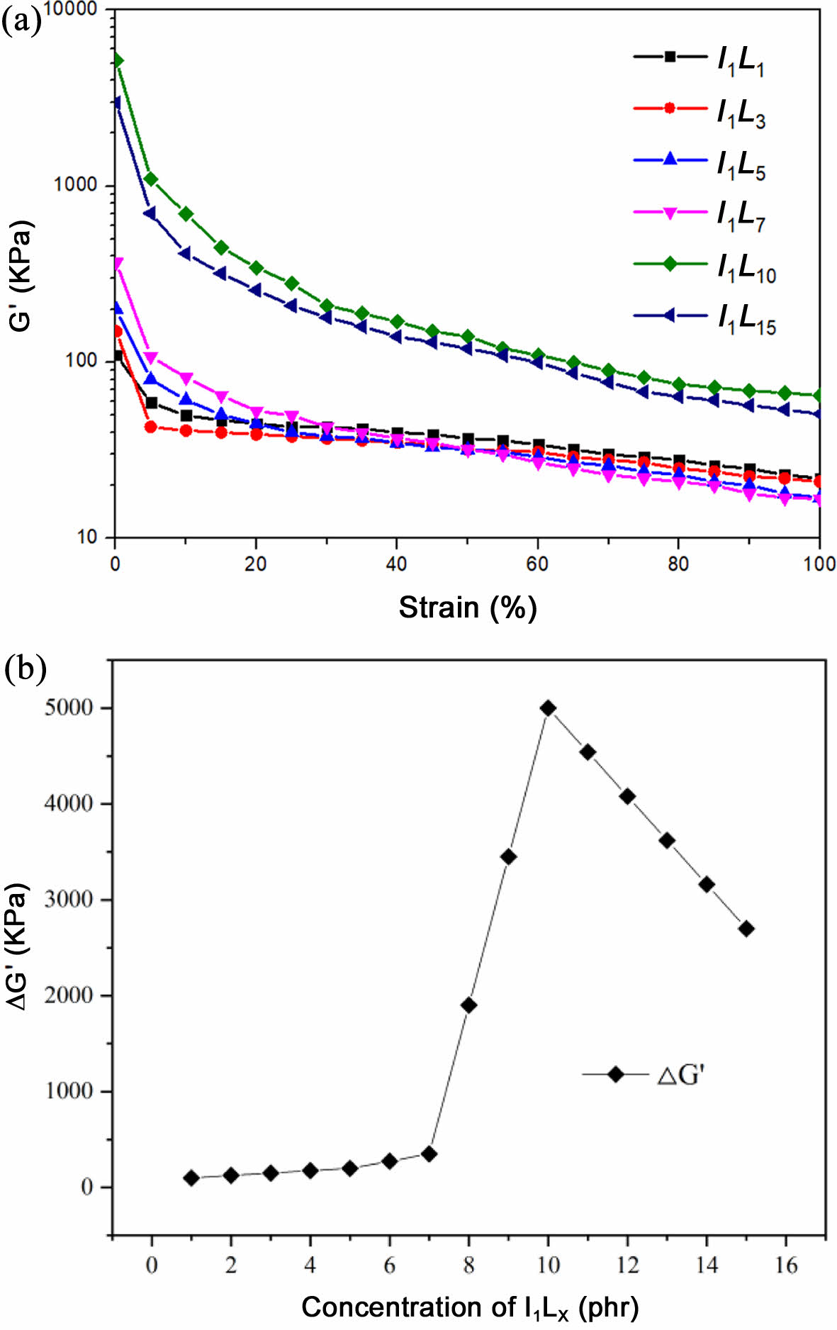 Dynamic Rheological Properties of Composites. The dynamic modulus of rubber decreases with increasing strain, a phenomenon known as the Payne effect. Payne effect is mainly used to characterize the interaction between filler and filler in rubber composites. The stronger the filler network structure is, the more obvious the effect will be.14-15 G' represents the destruction and reconstruction of filler network. As can be seen from Figure 7, when the filling amount of CNTs is 1-10 phr, the initial energy storage modulus is positively correlated with the filling amount of CNTs. As the filling amount of CNTs continues to increase, the initial energy storage modulus has a downward trend. When the strain is less than 10%, the energy storage modulus decreases rapidly, resulting in the destruction of the packing network structure. At this time, the destruction speed of the packing network is much faster than the reconstruction speed. However, when the damage of filler network reaches a certain degree, the energy storage modulus G' is no longer related to the strain, and G' tends to a constant value. The strength of the packing mesh can be shown by the decay value of the storage modulus. When the filling amount of CNTs is increased, the structure of the filler network is also enhanced. When the filling amount of CNTs is 10 phr, the packing network structure is the strongest, indicating that the dispersion of CNTs in the silicone rubber matrix is the best.16-18