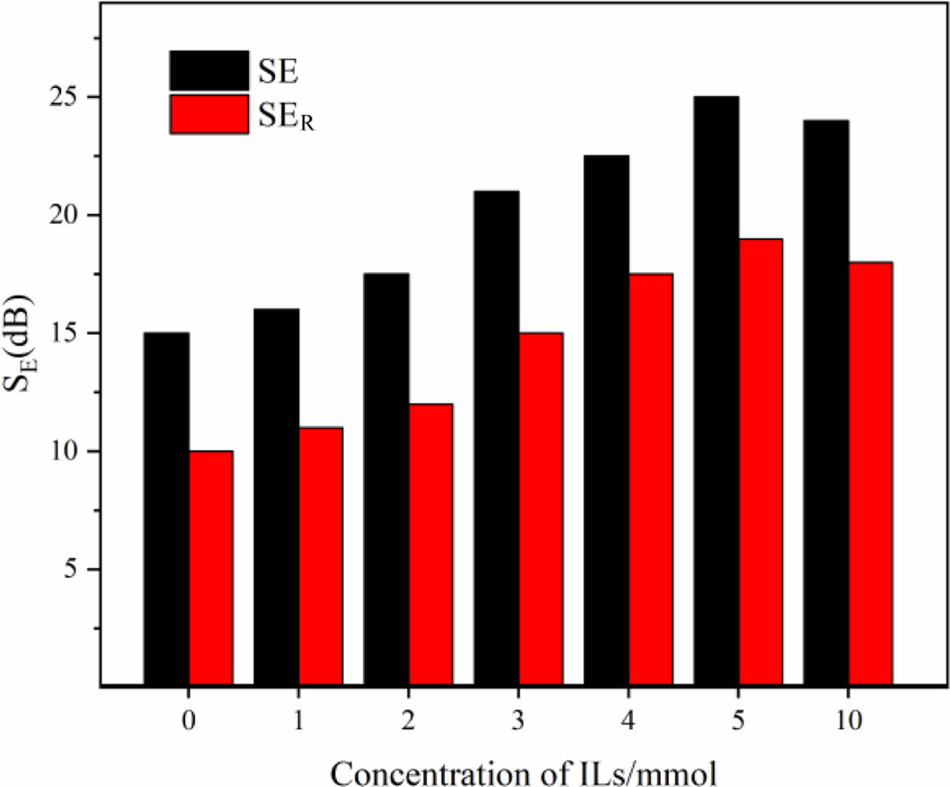 As shown in Figure 10, the electromagnetic shielding efficiency caused by absorption and reflection (SEA and SER) increases with the increase of the mass fraction of ionic liquid. It can be seen from the experimental data that the contribution of reflection loss to electromagnetic attenuation is greater than that of absorption loss due to the increase of electrical conductivity. To sum up, the shielding of electromagnetic waves by electromagnetic shielding silicone rubber is mainly completed by reflection loss.