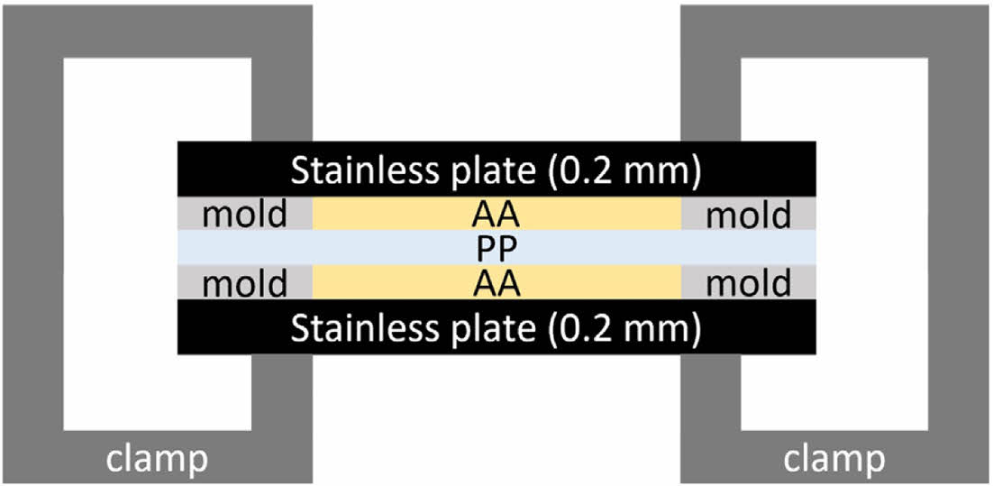 다공성 PP 막 제조. 다공성 PP 막은 두개의 스테인리스판과 알루미늄 몰드를 사용하여 준비된다. 스테인리스판(7 × 7 cm2 × 2 mm)은 증류수, 메탄올, 아세톤 100 mL에 각 5분간 세척한다. 알루미늄 몰드(3 × 5 cm2 × 0.015 mm) 스페이서(spacer)를 스테인리스판에 붙인다. AA는 100 ℃에서 10 분간 가열하여 액체 상태로 만든 후 알루미늄 몰드에 50 mL 캐스팅한다. 기공 없는 PP 필름을 두 판 사이에 삽입하여 c형 클램프로 밀봉한 후 15분간 질소퍼징한다(Figure 1). 서로 다른 온도(140, 150, 160, 170 ℃)의 오븐에 12시간 넣어 AA를 PP 필름에 침투시킨다. 이후 몰드 전체를 수조에 수직으로 놓고 4 ℃ 물을 3 cm/min의 속도로 주입하여 AA를 결정화 하였다.완전히 응고된 후 판에서 몰드를 꺼내어 50 ℃ 온도의 300 mL 에탄올에 넣고 24시간 동안 100 rpm으로 교반하면서 AA를 제거한다. 건조한 막을 얻기 위해 에탄올에서 샘플을 꺼내어 30 mL의 에탄올-헥산 순서로 상온 조건에서 5 분간 세척한 다음 상온에서 24시간 동안 건조시킨다.