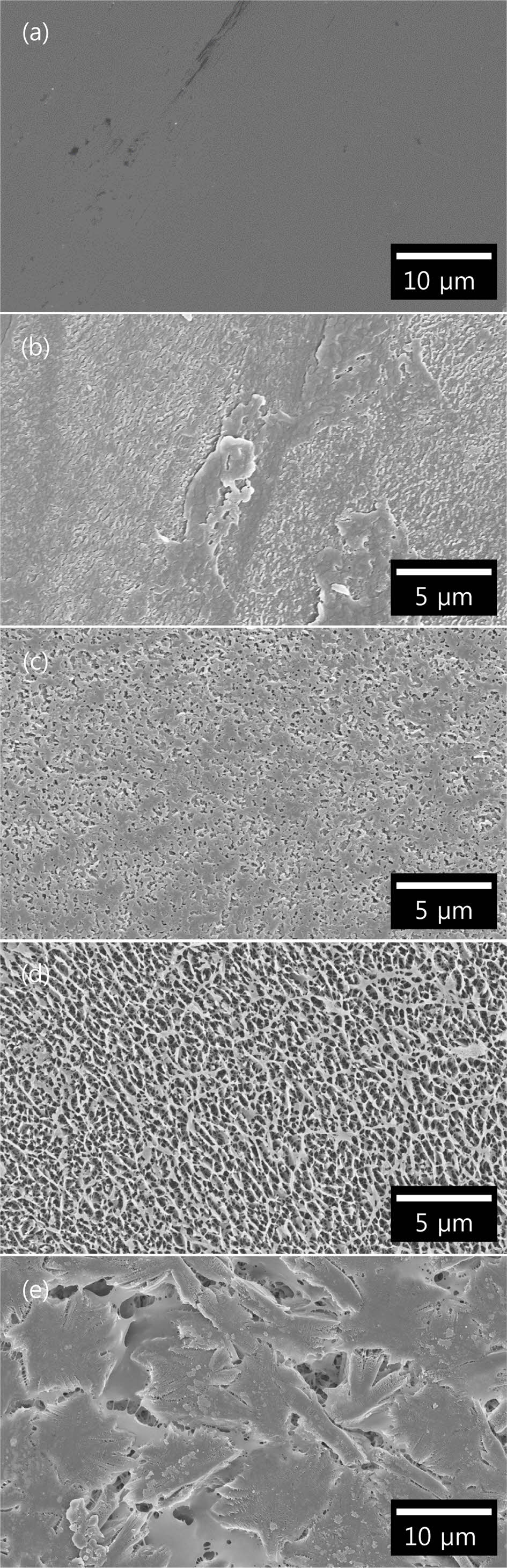 Figure 2 Surface SEM images of polypropylene membranes (12 h penetration time): (a) Neat PP; (b) 140 ℃; (c) 150 ℃; (d) 160 ℃; (e) 170℃. |