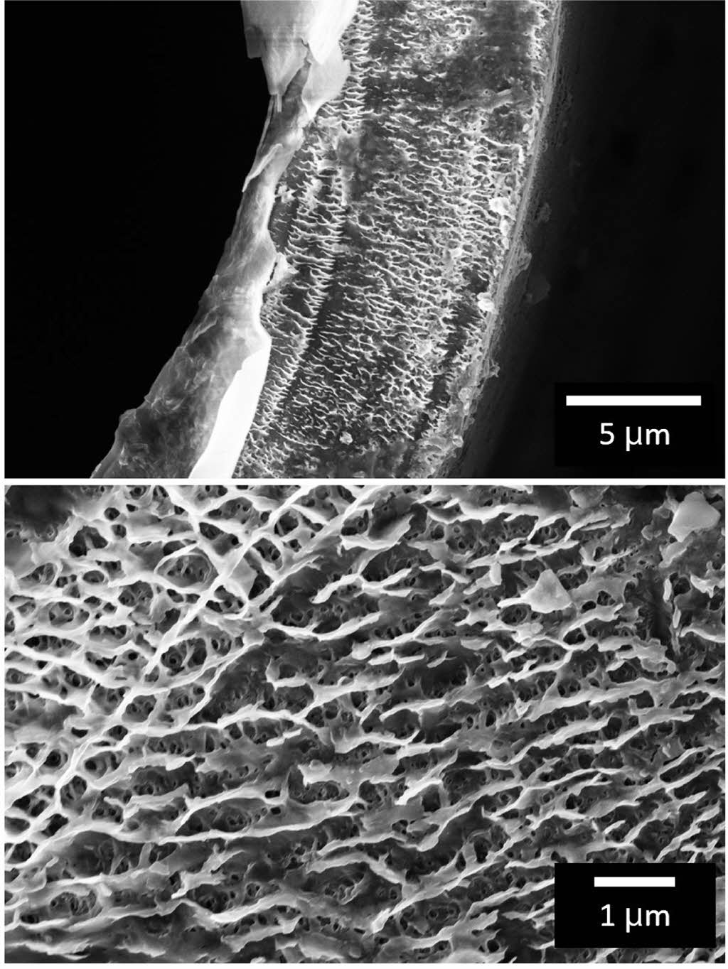 Figure 3 Cross-section SEM images of polypropylene membrane (12 h and 160 ℃ penetration). |
