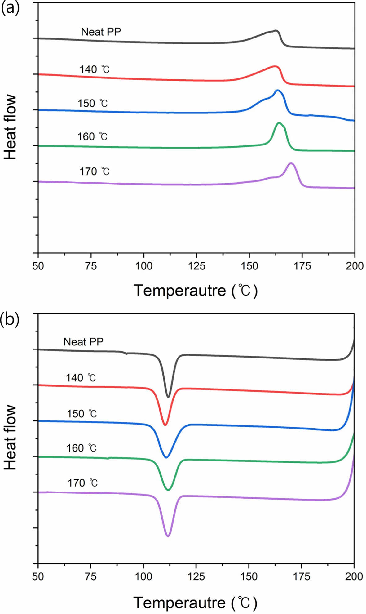 Figure 5 DSC: (a) heating; (b) cooling curves of PP membranes from different penetration temperatures. |