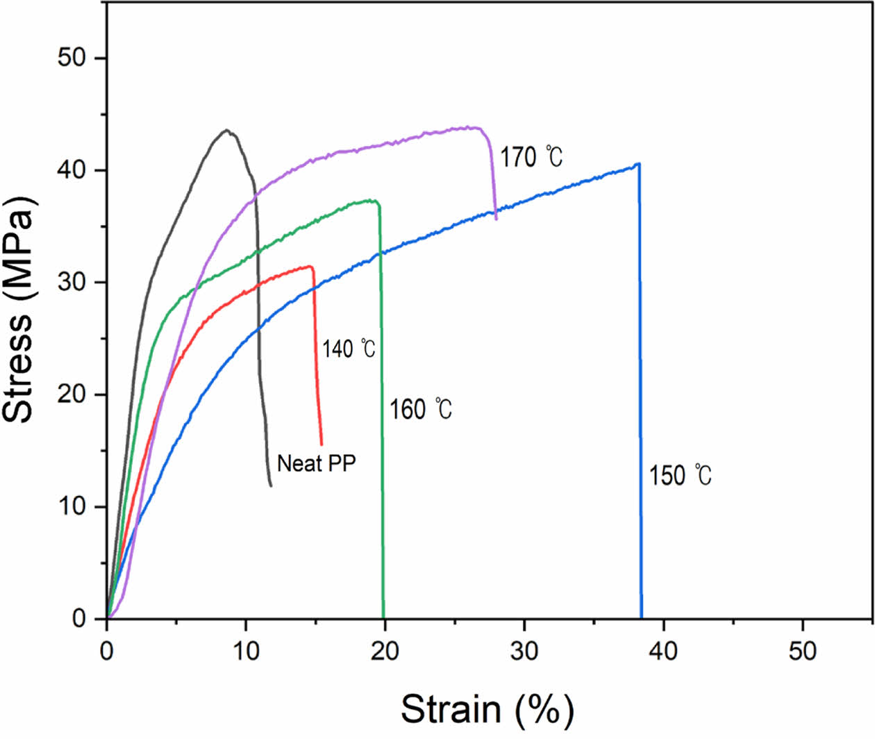 Figure 6 Typical stress-strain curves of PP membranes under uniaxial tension. |