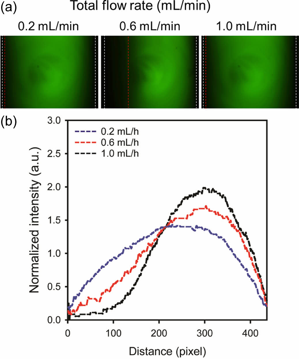 Figure 1 (a) Fluorescent microscopy images; (b) corresponding fluorescent profiles of the concentration gradient at different flow rates (0.2, 0.6, and 1.0 mL/h). |